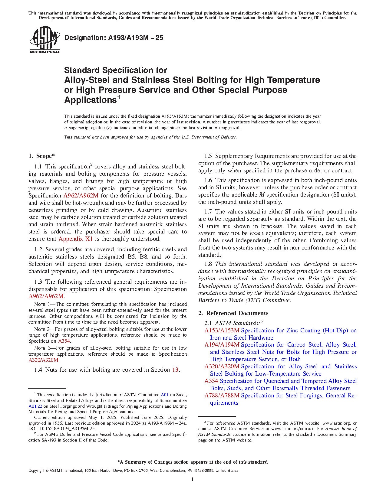 1.1 This specification2 covers alloy and stainless steel bolting materials and bolting components for pressure vessels, valves, flanges, and fittings for high temperature or high pressure service, or other special purpose applications. See Specification A962/A962M for the definition of bolting. Bars and wire shall be hot-wrought and may be further processed by centerless grinding or by cold drawing. Austenitic stainless steel may be carbide solution treated or carbide solution treated and strain-hardened. When strain hardened austenitic stainless steel is ordered, the purchaser should take special care to ensure that Appendix X1 is thoroughly understood.
