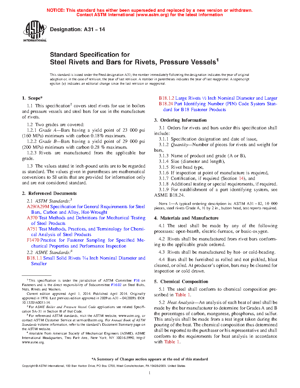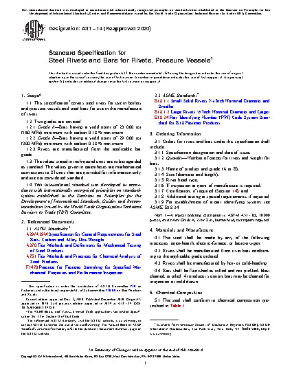 1.1 This specification covers steel rivets for use in boilers and pressure vessels and steel bars for use in the manufacture of rivets.