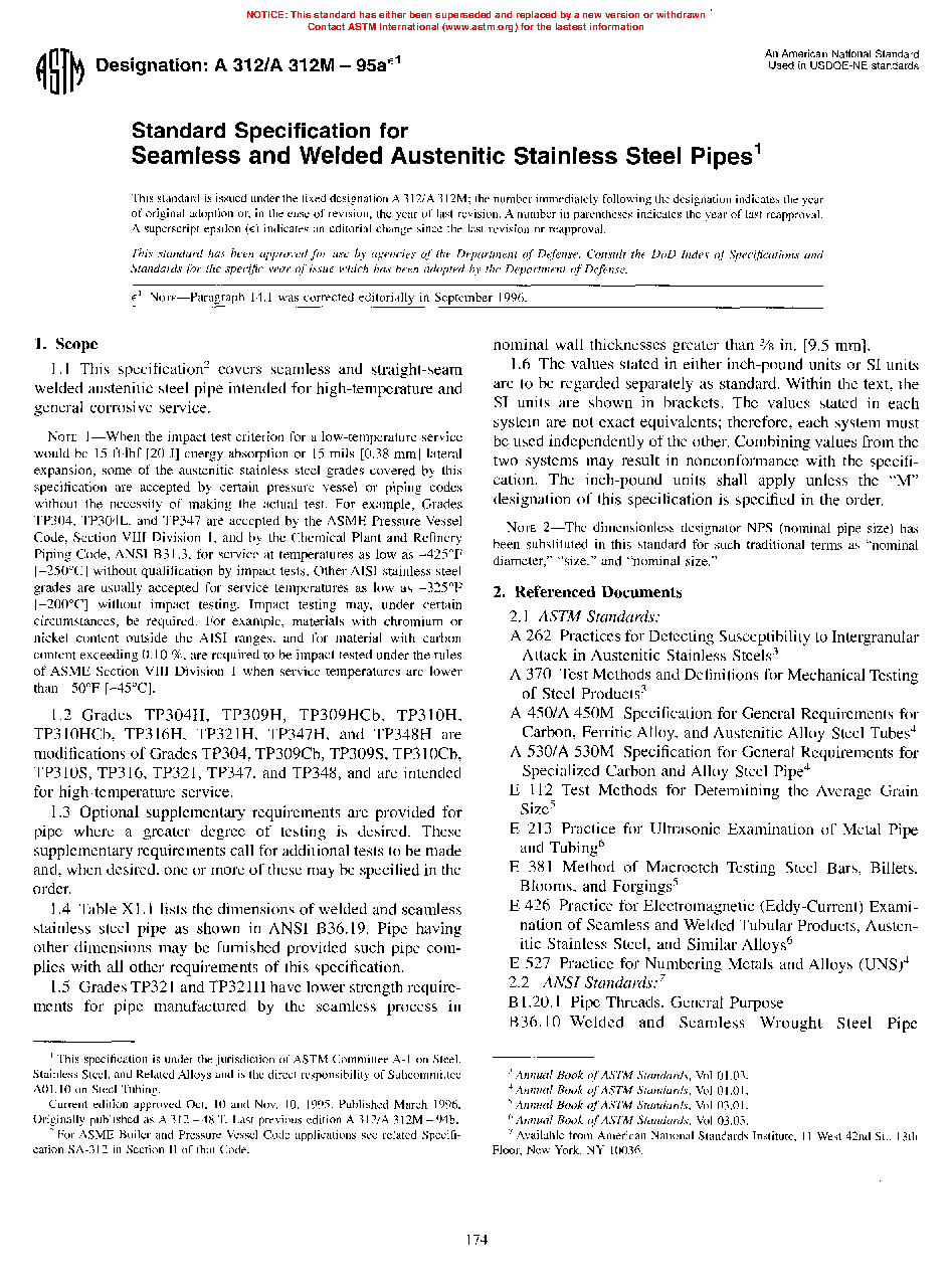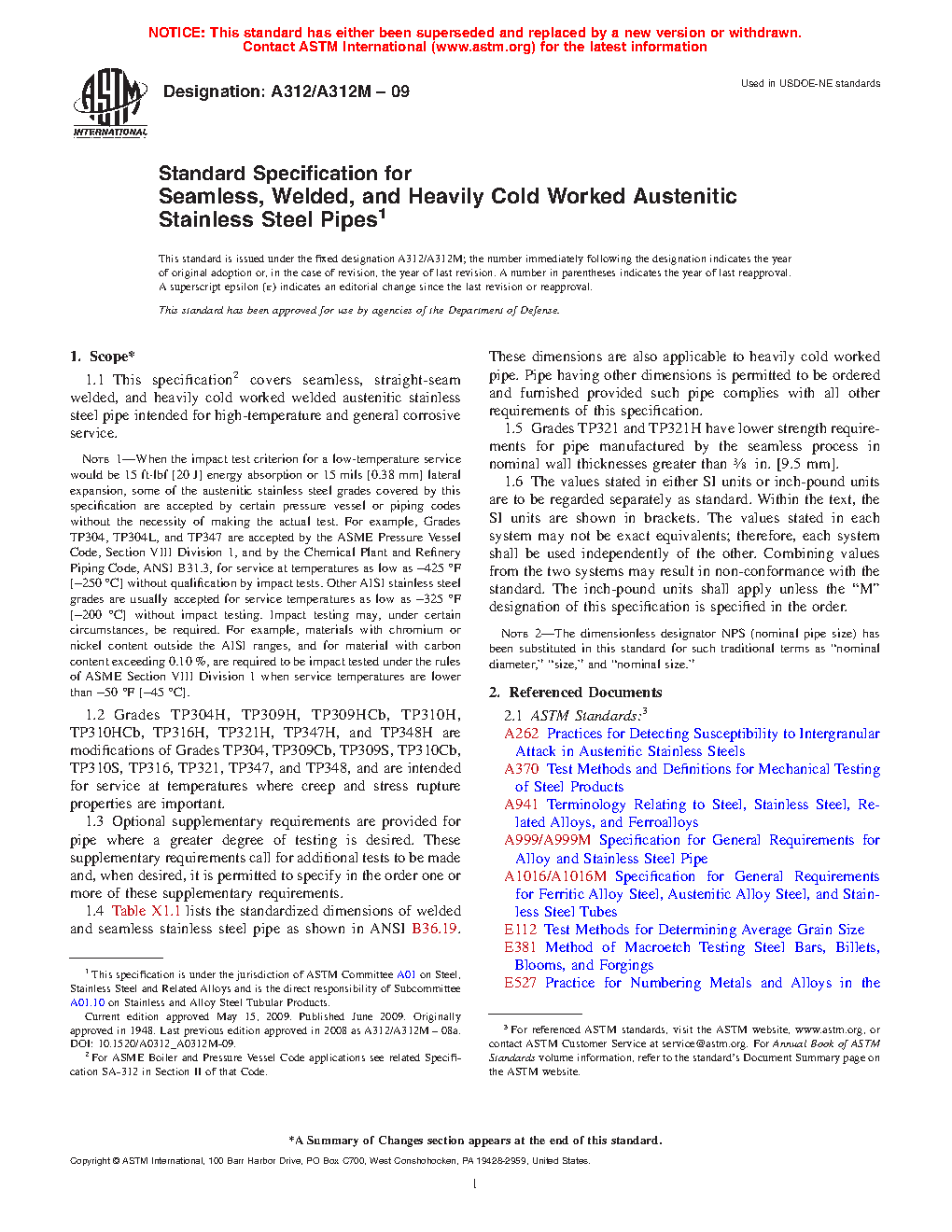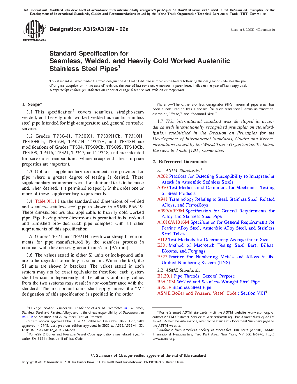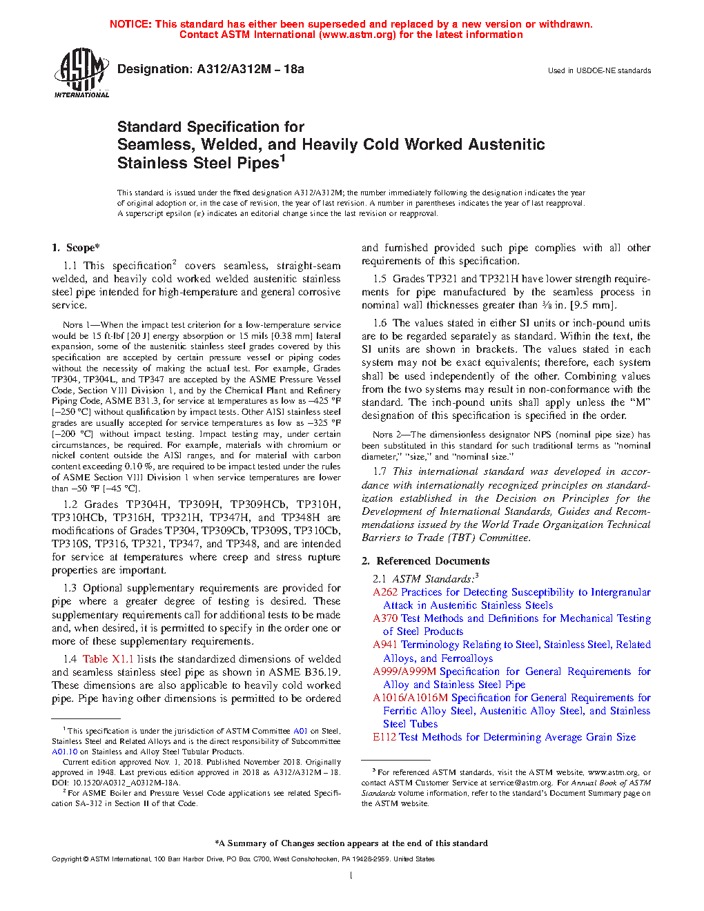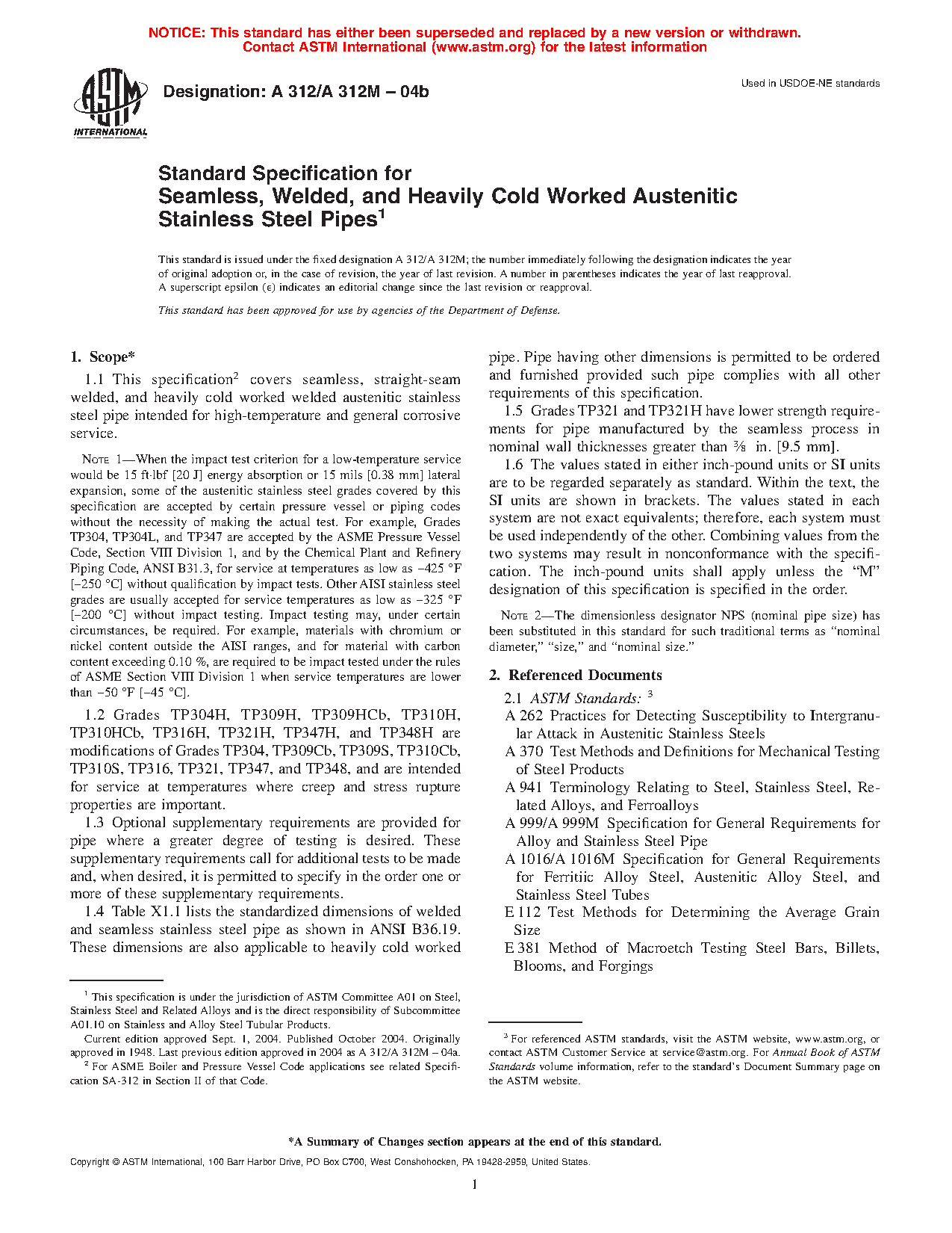 1.1 This specification2 covers seamless, straight-seam welded, and heavily cold worked welded austenitic stainless steel pipe intended for high-temperature and general corrosive service.
