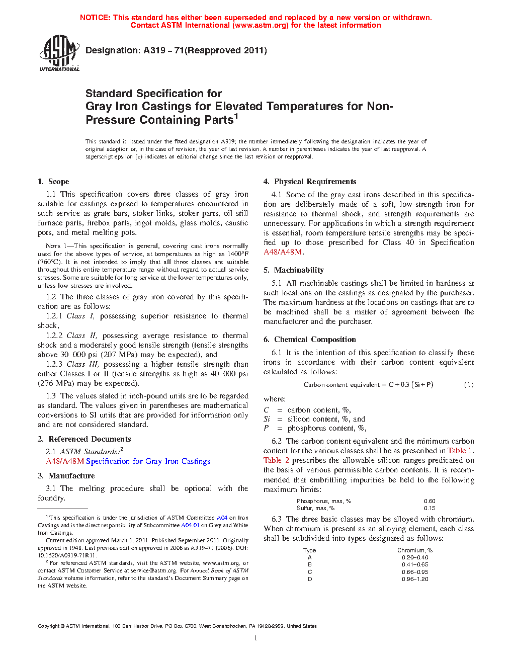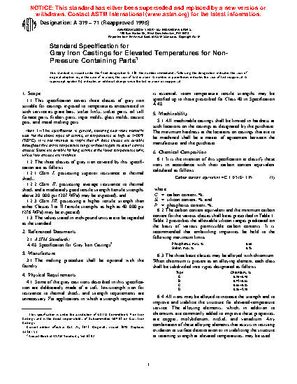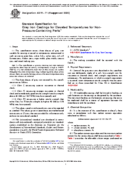 This specification covers gray iron castings exposed to elevated temperatures for non-pressure containing parts such as grate bars, stoker links, stoker parts, oil still furnace parts, firebox parts, ingot molds, glass molds, caustic pots, and metal melting pots. The three classes of gray iron covered here are: Class I, possessing superior thermal shock resistance; Class II, possessing average thermal shock resistance and moderately good tensile strength; and Class III, possessing a higher tensile strength than either Classes I or II. It is the intention of this specification to classify the irons in accordance with their carbon content equivalent, wherein the equation for its calculation is given herein.