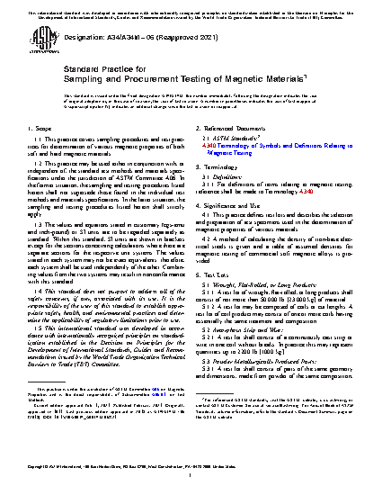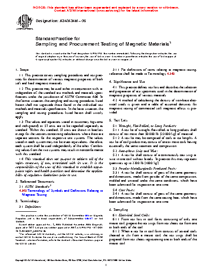 1.1 This practice covers sampling procedures and test practices for determination of various magnetic properties of both soft and hard magnetic materials.