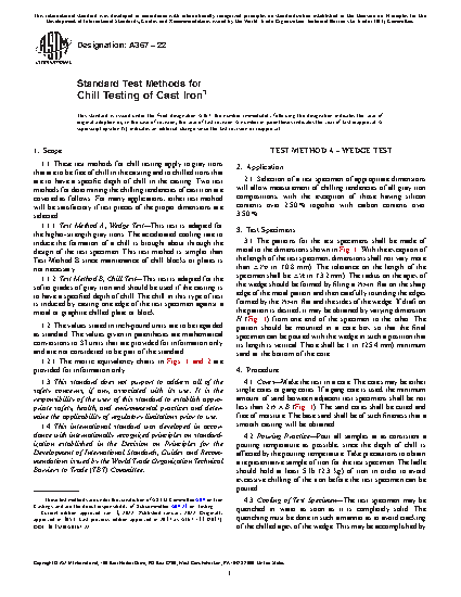 This test method deals with gray irons that are to be free of chill in the casting and to chilled irons that are to have a specific depth of chill in the casting. The purpose of the test is to determine the chilling tendencies of cast iron. The two tests are wedge test and chill test. Both tests shall be made in a core which may either be single cores or gang cores and a pouring practice shall be performed. The wedge test is generally better adapted to the higher strength gray irons. The accelerated cooling rate that shall induce the formation of a chill shall be brought about through the design of the test specimen. The chill test is better adapted to the softer grades of gray iron and should be used if the casting have a specified depth of chill. The chill in this type of test shall be induced by casting one edge of the test specimen against a metal or graphite chilled plate or block. Wedge test is simpler than chill test since in the wedge test, maintenance of chill blocks or plates is not necessary.