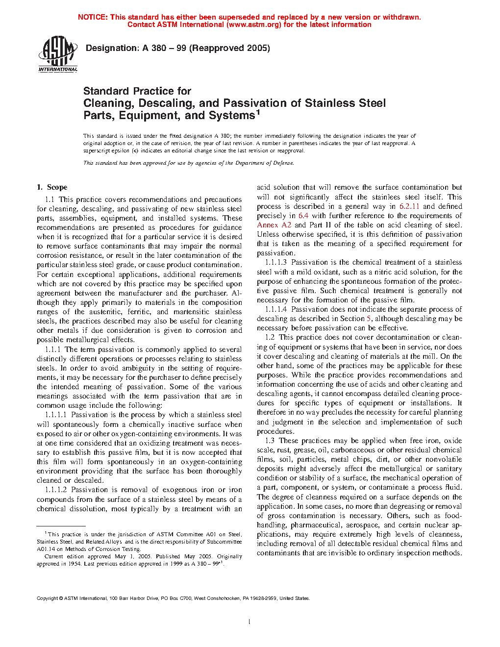 1.5 This practice provides definitions and describes good pratices for cleaning, descaling, and passivation of stainless steel parts, but does not provide tests with acceptance criteria to demonstrate that the passivation procedures have been successful. For such tests, it is appropriate to specify one of the practices listed in Specification A 967.
