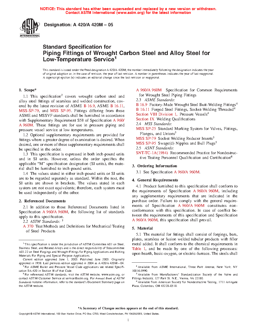 1.1 This specification2 covers wrought carbon steel and alloy steel fittings of seamless and welded construction, covered by the latest revision of ASME B16.9, ASME B16.11, MSS SP-79, MSS SP-83, MSS SP-95, and MSS SP-97. Fittings differing from these ASME and MSS standards shall be furnished in accordance with Supplementary Requirement S58 of Specification A960/A960M. These fittings are for use in pressure piping and pressure vessel service at low temperatures.