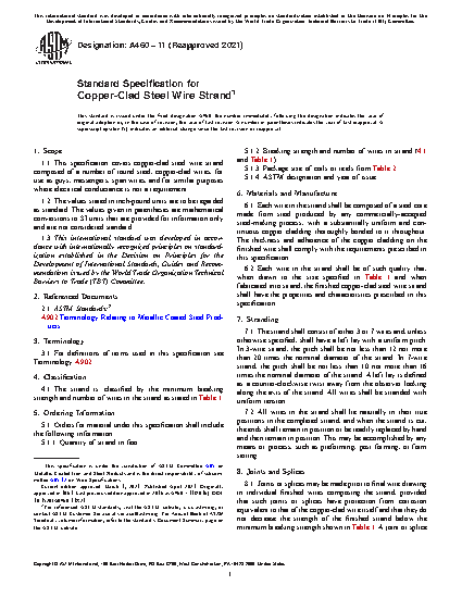1.1 This specification covers copper-clad steel wire strand composed of a number of round steel, copper-clad wires, for use as guys, messengers, span wires, and for similar purposes where electrical conductance is not a requirement.