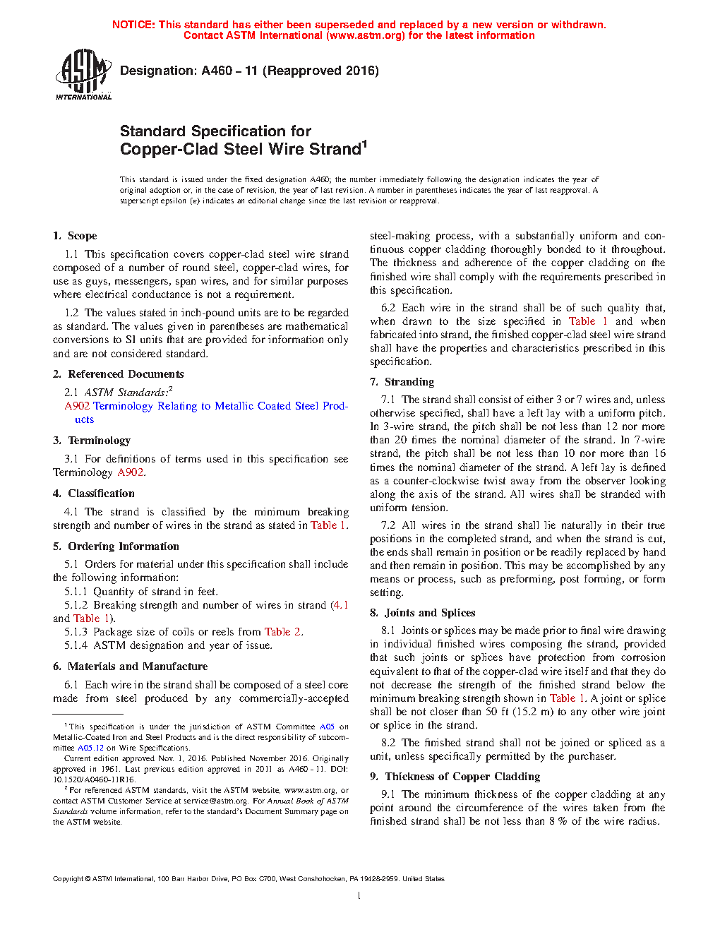 Standard Specification for Copper-Clad Steel Wire Strand