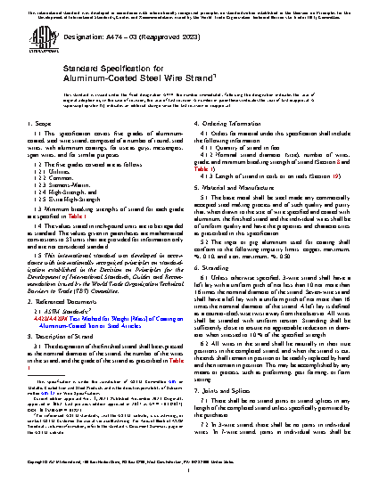 1.1 This specification covers five grades of aluminum-coated, steel wire strand, composed of a number of round, steel wires, with aluminum coatings, for use as guys, messengers, span wires, and for similar purposes.