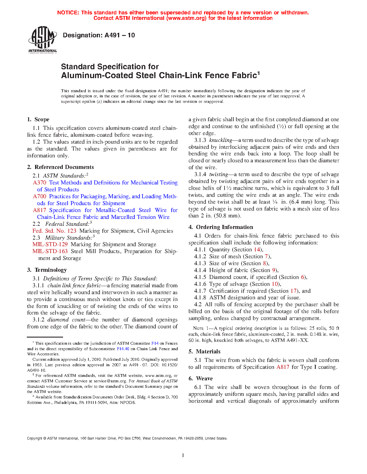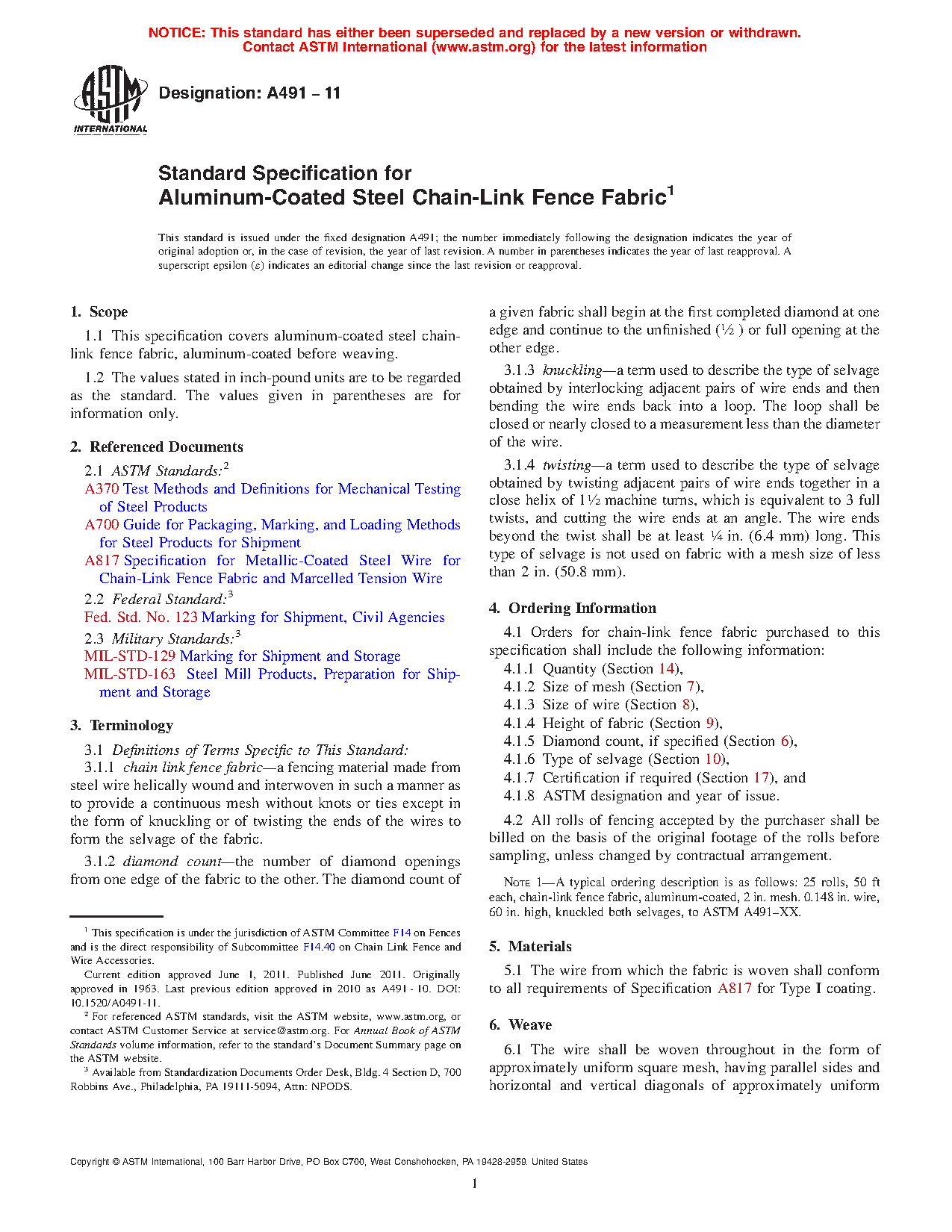 This specification covers the basic physical requirements for steel chain-link fence fabric that are aluminum-coated before weaving. Fabrics conforming to this specification shall meet specified requirements for weave form and typical diamond count, size of mesh, size of wire, height of fabric, selvage, weight of aluminum coating, breaking strength, workmanship and finish, and standard length of rolls.