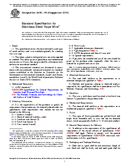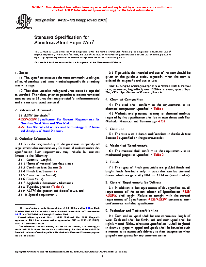 1.1 This specification covers the more commonly used types of round stainless steel wire intended especially for stranding into wire rope.