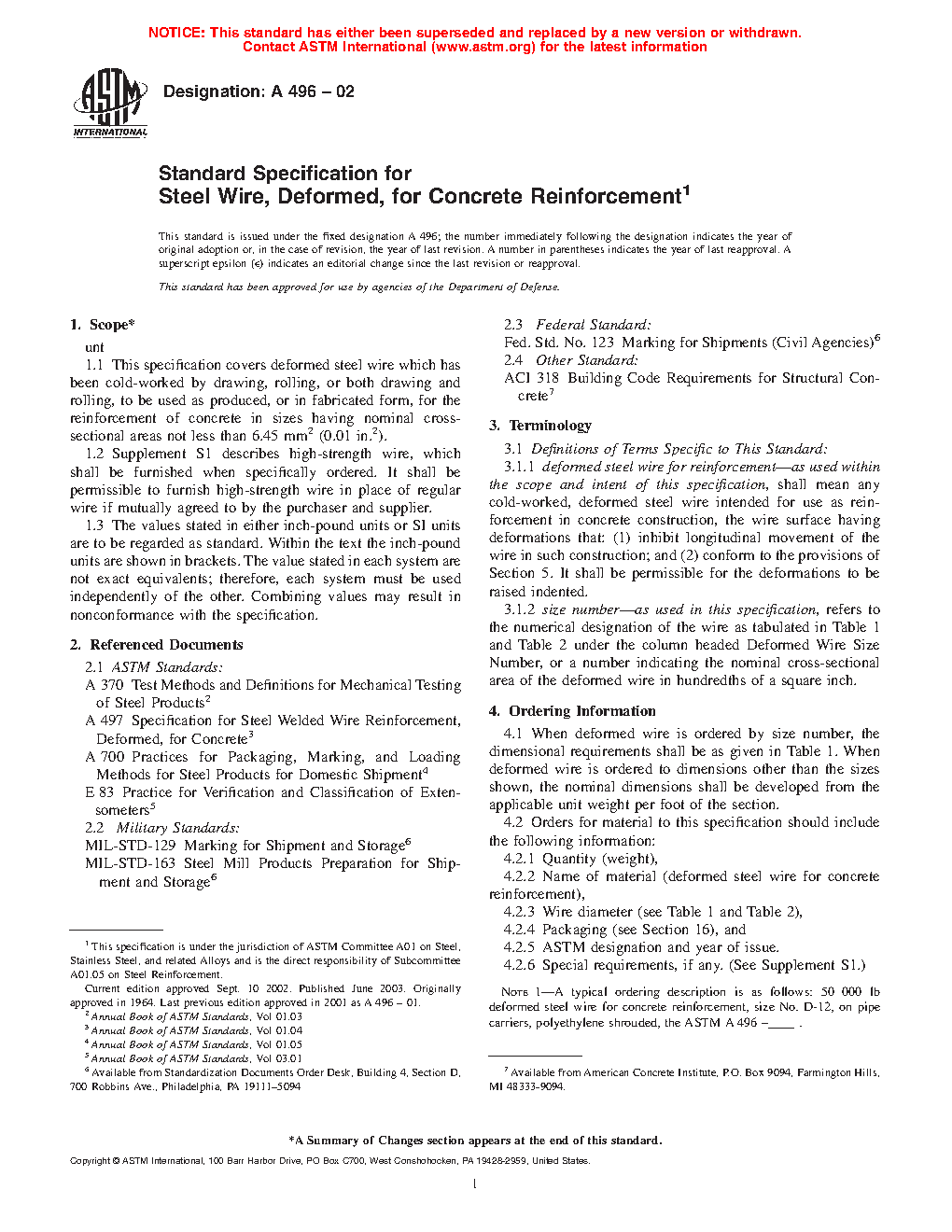 1.1 This specification covers deformed steel wire which has been cold-worked by drawing, rolling, or both drawing and rolling, to be used as produced, or in fabricated form, for the reinforcement of concrete in sizes having nominal cross-sectional areas not less than 6.45 mm 2 [0.01 in.2].
