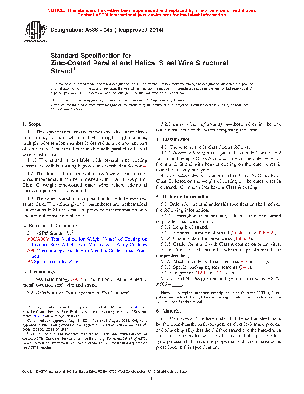Standard Specification for Zinc-Coated Parallel and Helical Steel Wire Structural Strand and Zinc-Coated Wire for Spun-In-Place Structural Strand