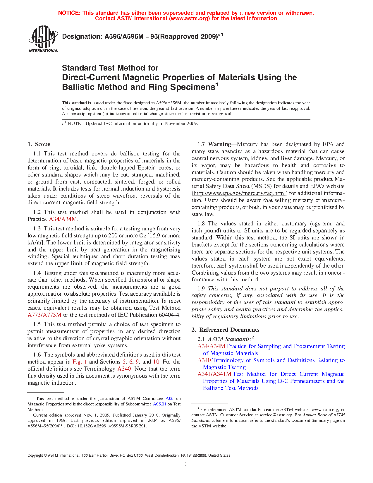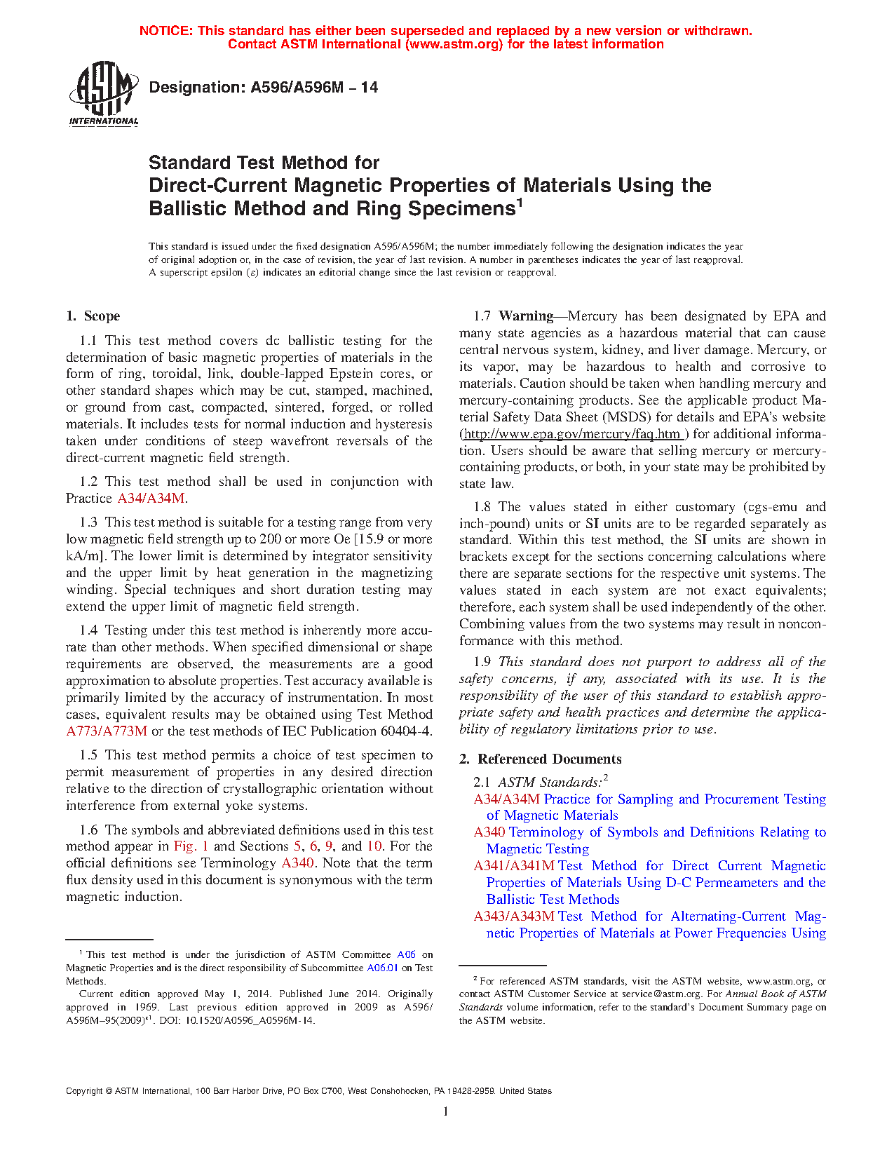 1.7 Warning—Mercury has been designated by EPA and many state agencies as a hazardous material that can cause central nervous system, kidney, and liver damage. Mercury, or its vapor, may be hazardous to health and corrosive to materials. Caution should be taken when handling mercury and mercury-containing products. See the applicable product Material Safety Data Sheet (MSDS) for details and EPA’s website (http://www.epa.gov/mercury/faq.htm ) for additional information. Users should be aware that selling mercury or mercury-containing products, or both, in your state may be prohibited by state law.