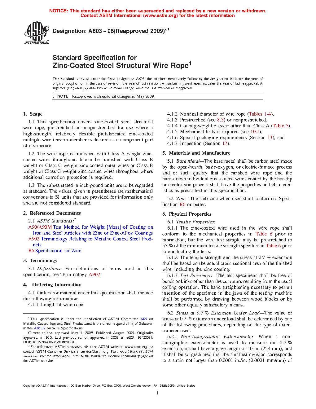 1.1 This specification covers zinc-coated steel structural wire rope, prestretched or nonprestretched for use where a high-strength, relatively flexible prefabricated zinc-coated multiple-wire tension member is desired as a component part of a structure.