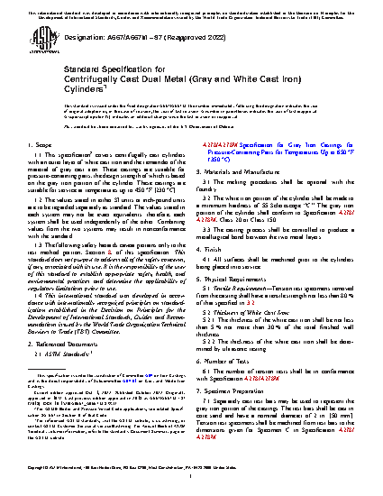 1.1 This specification2 covers centrifugally cast cylinders with an outer layer of white cast iron and the remainder of the material of gray cast iron. These castings are suitable for pressure-containing parts, the design strength of which is based on the gray iron portion of the cylinder. These castings are suitable for service at temperatures up to 450 °F [230 °C].