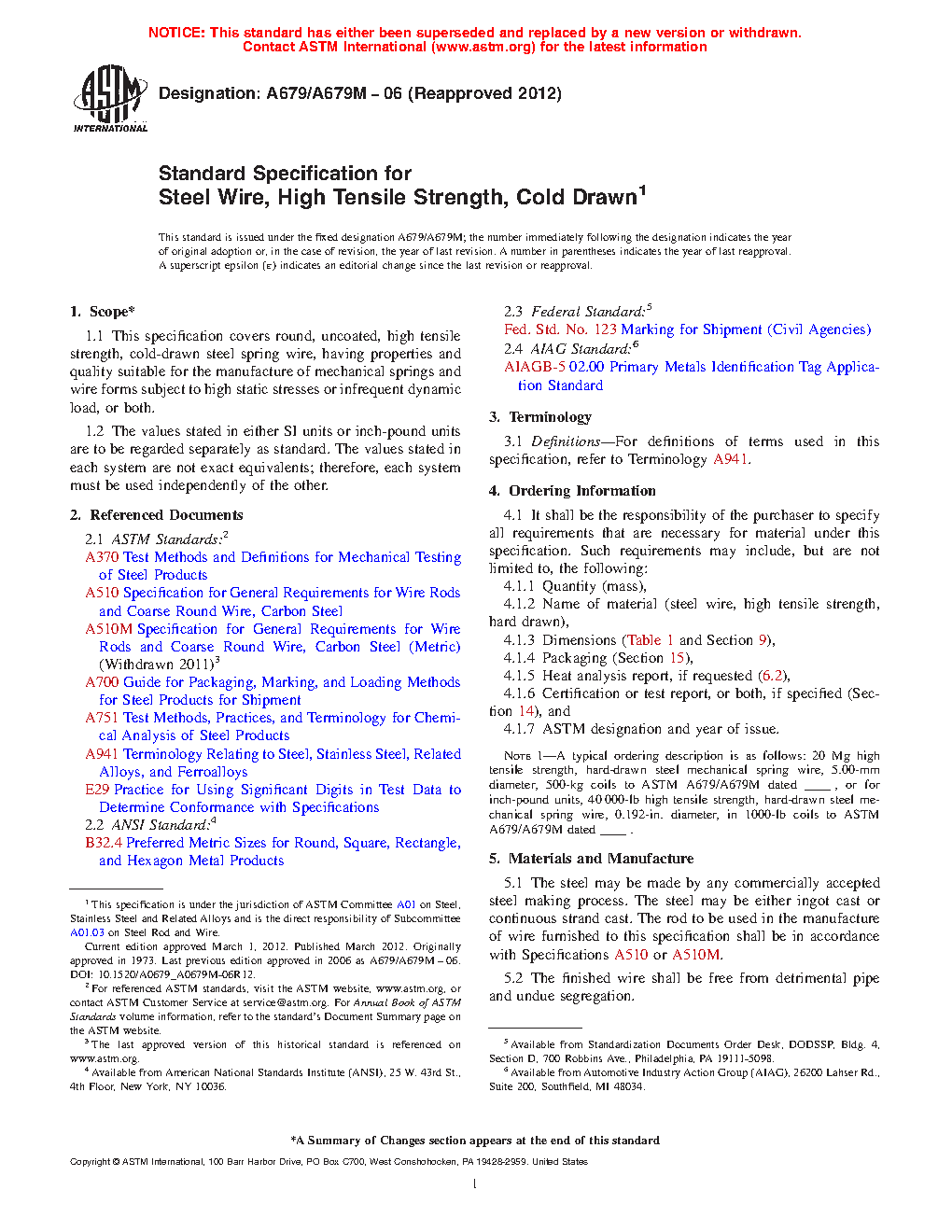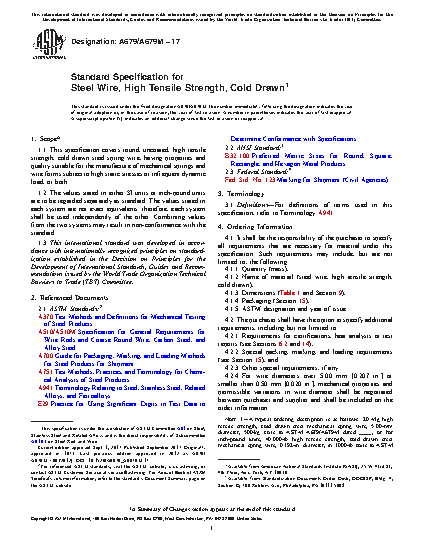 1.1 This specification covers round, high tensile strength, cold drawn steel spring wire, having properties and quality suitable for the manufacture of mechanical springs and wire forms subject to high static stresses or infrequent dynamic load, or both.