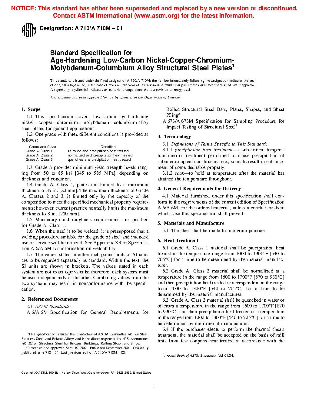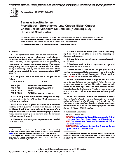 1.1 This specification covers low-carbon precipitation — strengthened nickel - copper - chromium - molybdenum - columbium (niobium) alloy steel plates for general applications. The alloys in this specification are strengthened by precipitation in various temperature ranges. Precipitation strengthening can occur upon air cooling after hot rolling, during normalizing, and by another heat treatment. These grades are not intended for use in applications above 900°F [480°C].