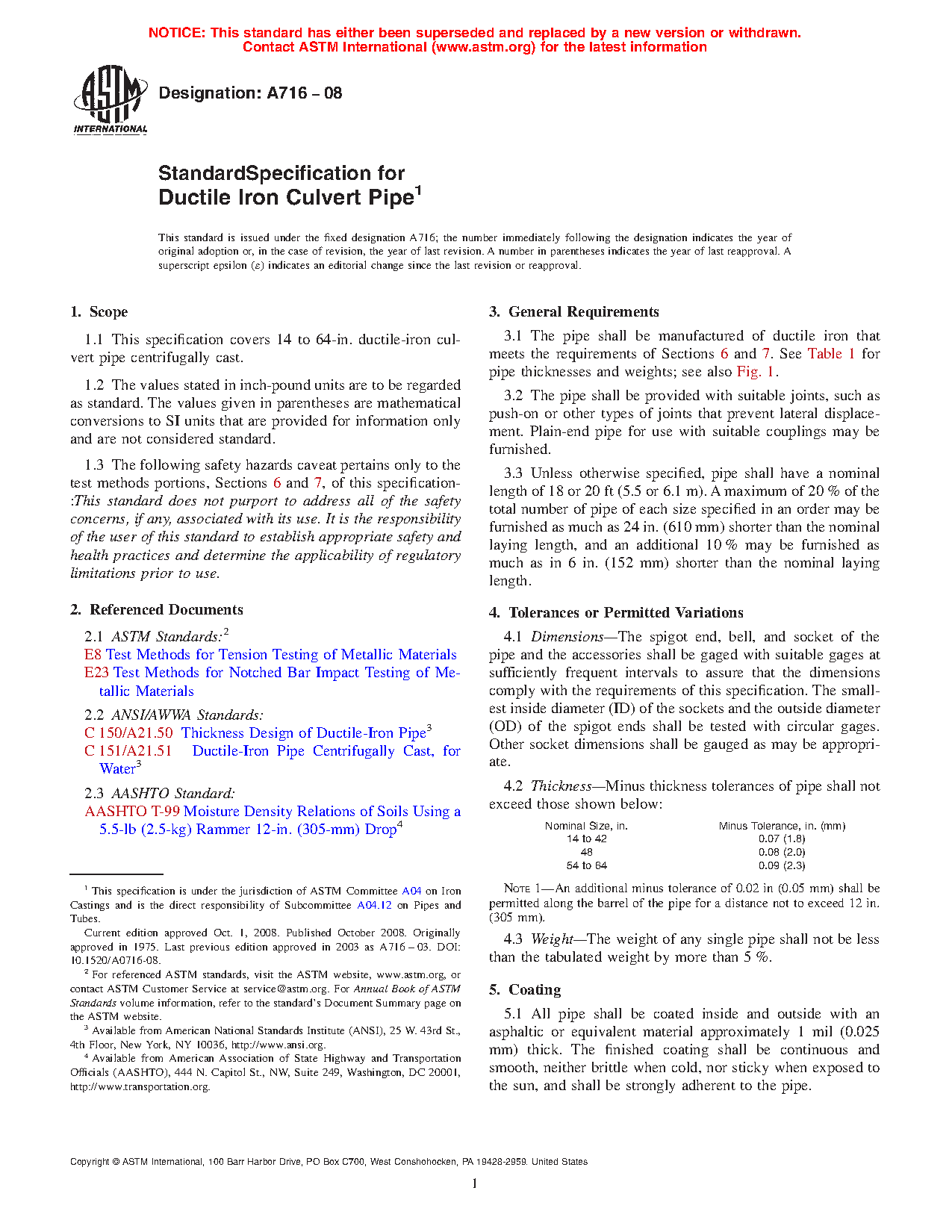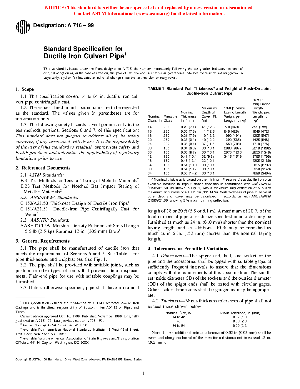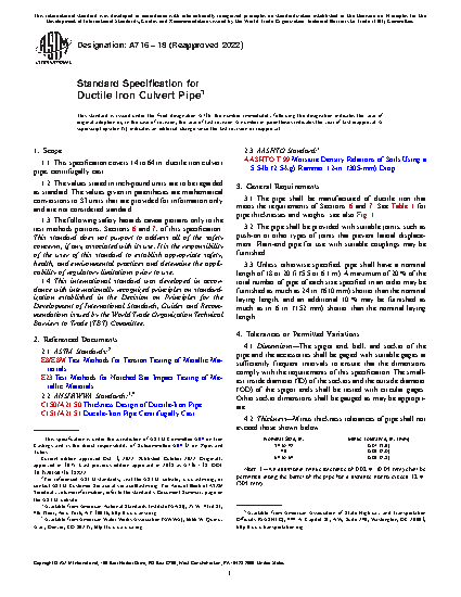 1.1 This specification covers 14 to 64-in. ductile iron culvert pipe, centrifugally cast.