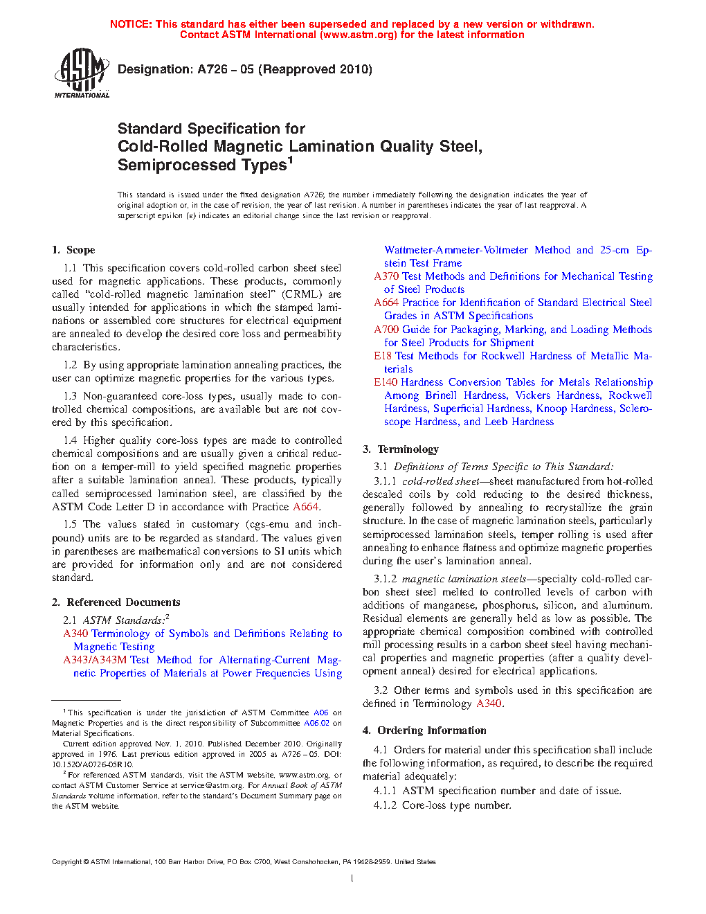 This specification covers the standard requirements for semi-processed cold-rolled magnetic lamination quality steels. These steels shall be made by the basic-oxygen or electric-furnace method and shall be processed by hot rolling, pickling, cold rolling, annealing, and temper rolling. Magnetic lamination steels shall have low-carbon contents and may have manganese, phosphorus, silicon, and aluminum additions to enhance punchability and to improve magnetic characteristics by increasing the electrical resistivity. There are no fixed chemical requirements for these steels only the requirement to meet the specified magnetic properties. These steels must be heat treated by the user to develop the specified magnetic properties. This specification covered steels with thicknesses of 0.0185 in. ( 0.47 mm), 0.022 in. (0.56 mm), 0.025 in. (0.64 mm), 0.028 in. (0.71 mm) and 0.031 in. (0.79 mm). For a given thickness there are three or more core loss types distinguished by maximum allowable core loss after a specified quality development anneal. Magnetic testing shall be done after the specified quality development anneal and shall use the Epstein test method. Magnetic testing shall be done at a test frequency of 60 Hz and a maximum flux density of 15 kG (1.5 T). Test methods to determine the magnetic and mechanical properties are listed. Other typical magnetic and physical properties are listed for reference.