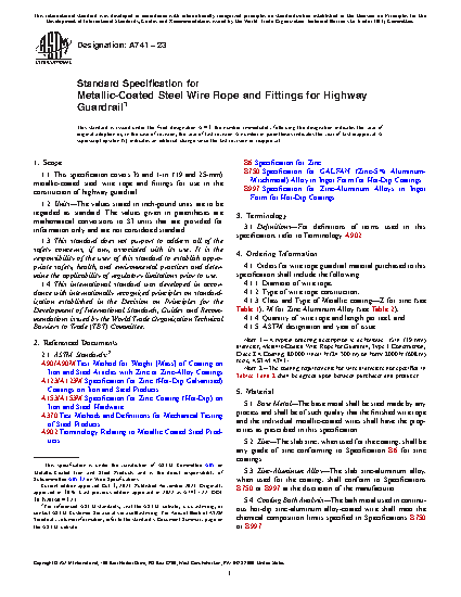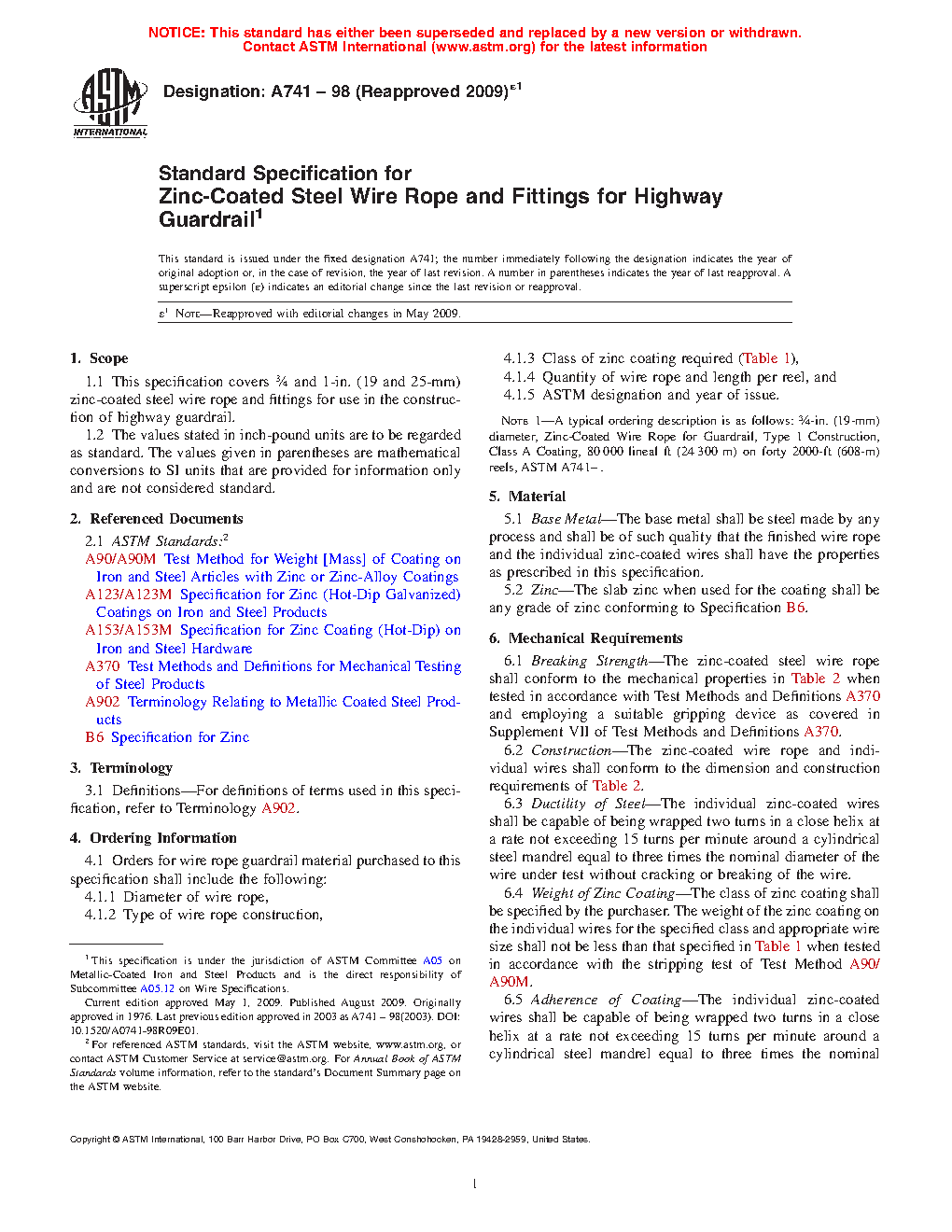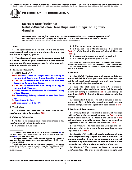 1.1 This specification covers 3/4 and 1-in. (19 and 25-mm) zinc-coated steel wire rope and fittings for use in the construction of highway guardrail.