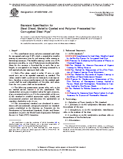 1.1 This specification covers polymer precoated steel sheet for corrugated steel pipe (CSP) which is coated after metallic coating on continuous lines by coil coating (roller coating or laminating) processes. The metallic coating is either zinc, 55 % aluminum-zinc alloy, or zinc-5 % aluminum-mischmetal alloy. Sheet for this purpose is furnished flat in coils, flat in cut lengths, or corrugated in cut lengths, all being protected by a mill-applied polymer coating on both sides.