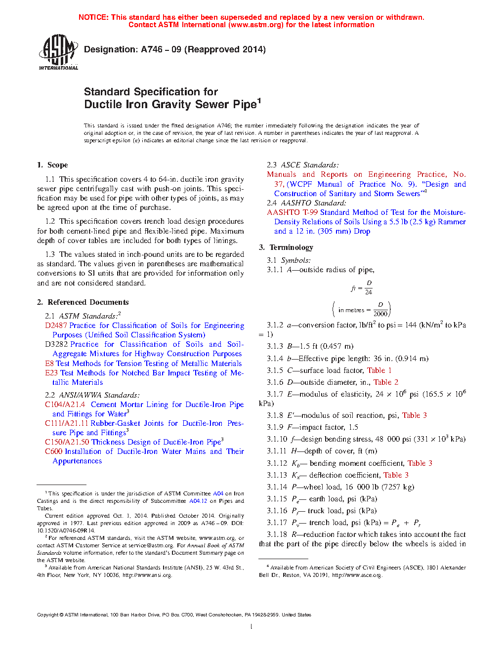 1.2 This specification covers trench load design procedures for both cement-lined pipe and flexible-lined pipe. Maximum depth of cover tables are included for both types of linings.