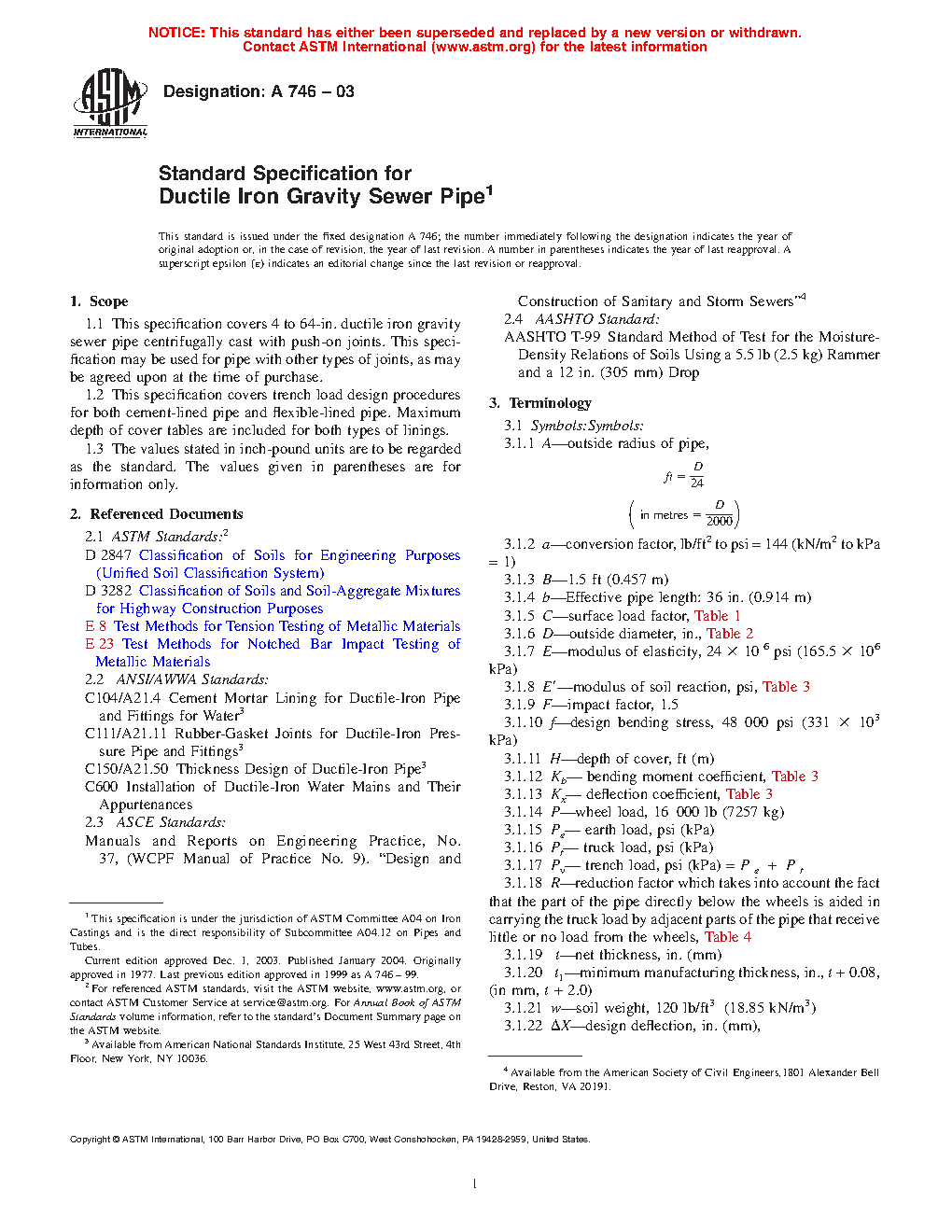 This specification covers ductile iron gravity sewer pipe centrifugally cast with push-on joints. This also covers trench load design procedures for both cement-lined pipe and flexible-lined pipe. Maximum depths of cover tables are included for both types of linings. Each pipe shall be subjected to a hydrostatic test and maybe performed either before or after the outside coating and inside coating have been applied, but shall be performed before the application of cement-mortar lining or of a special lining. The standard acceptance tests and additional control tests shall also be performed.