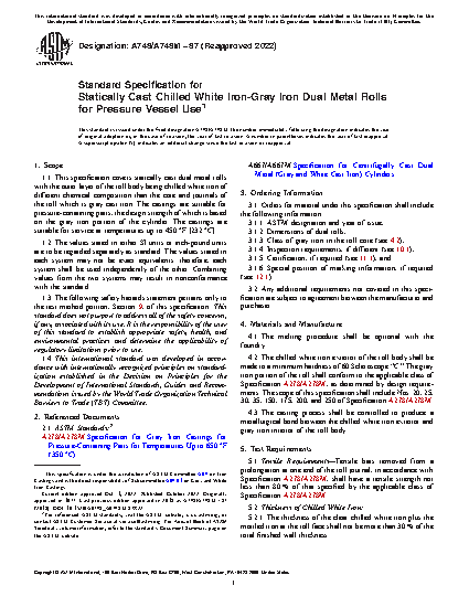 1.1 This specification covers statically cast dual metal rolls with the outer layer of the roll body being chilled white iron of different chemical composition than the core and journals of the roll which is gray cast iron. The castings are suitable for pressure-containing parts, the design strength of which is based on the gray iron portion of the cylinder. The castings are suitable for service at temperatures up to 450 °F [232 °C].