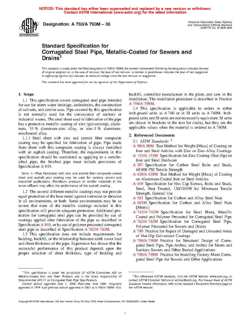 1.2 The several different metallic coatings may not provide equal protection of the base metal against corrosion or abrasion in all environments, or both. Some environments may be so severe that none of the metallic coatings included in this specification will provide adequate protection. Additional protection for corrugated steel pipe can be provided by use of coatings applied after fabrication of the pipe as described in Specification A 849, or by use of polymer precoated corrugated steel pipe as described in Specification A762/A762M.