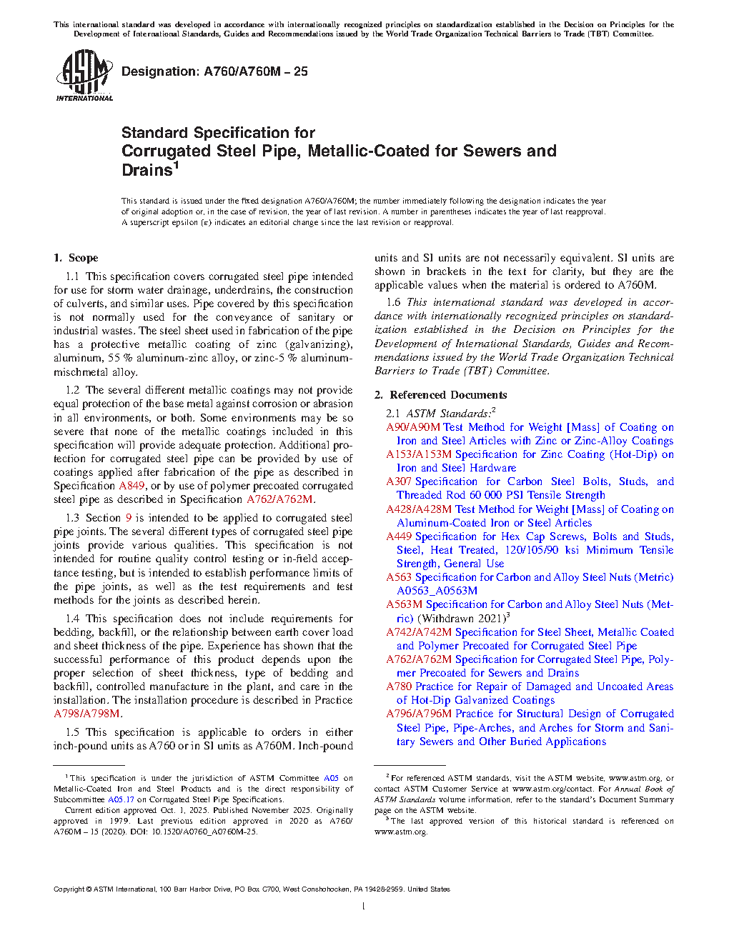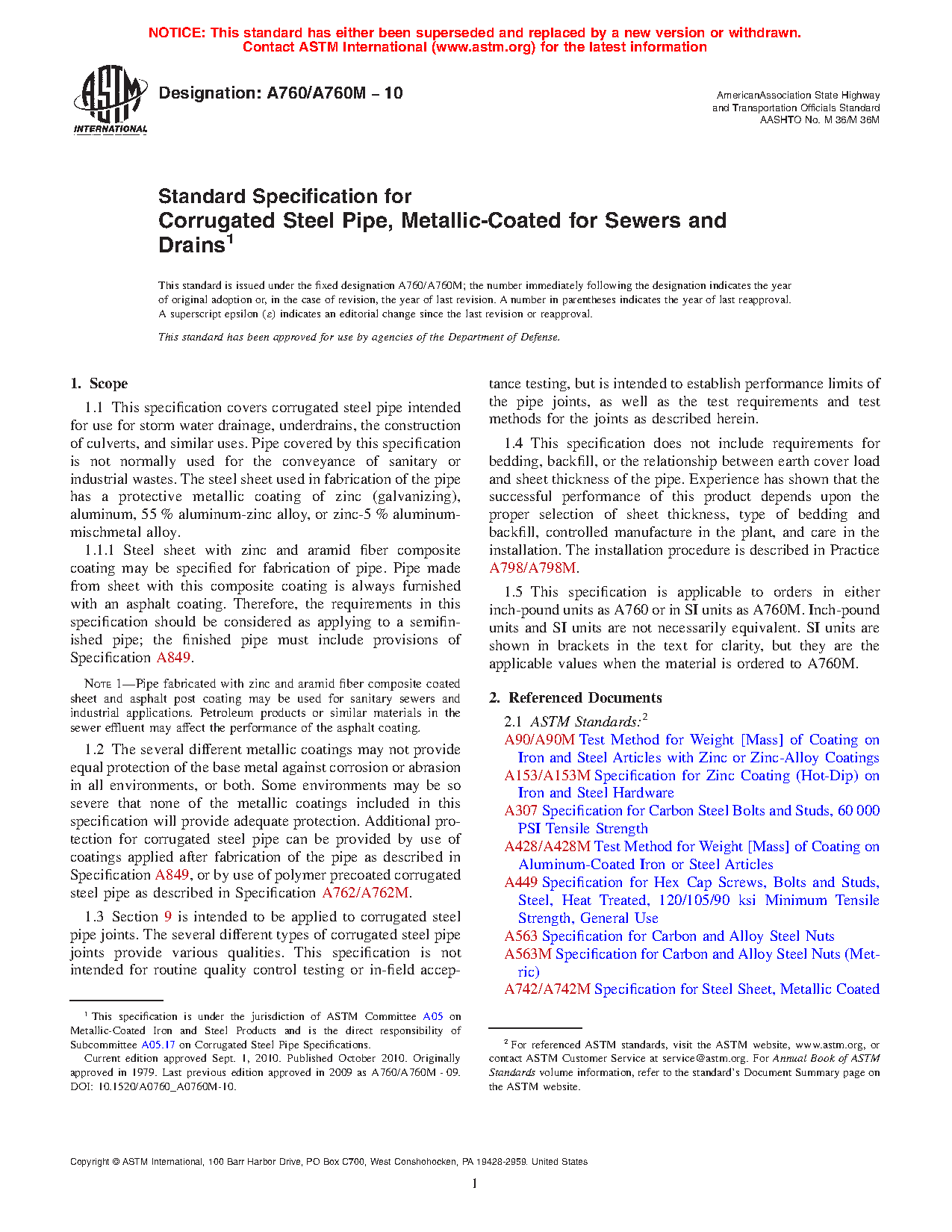 1.1 This specification covers corrugated steel pipe intended for use for storm water drainage, underdrains, the construction of culverts, and similar uses. Pipe covered by this specification is not normally used for the conveyance of sanitary or industrial wastes. The steel sheet used in fabrication of the pipe has a protective metallic coating of zinc (galvanizing), aluminum, 55 % aluminum-zinc alloy, or zinc-5 % aluminum-mischmetal alloy.