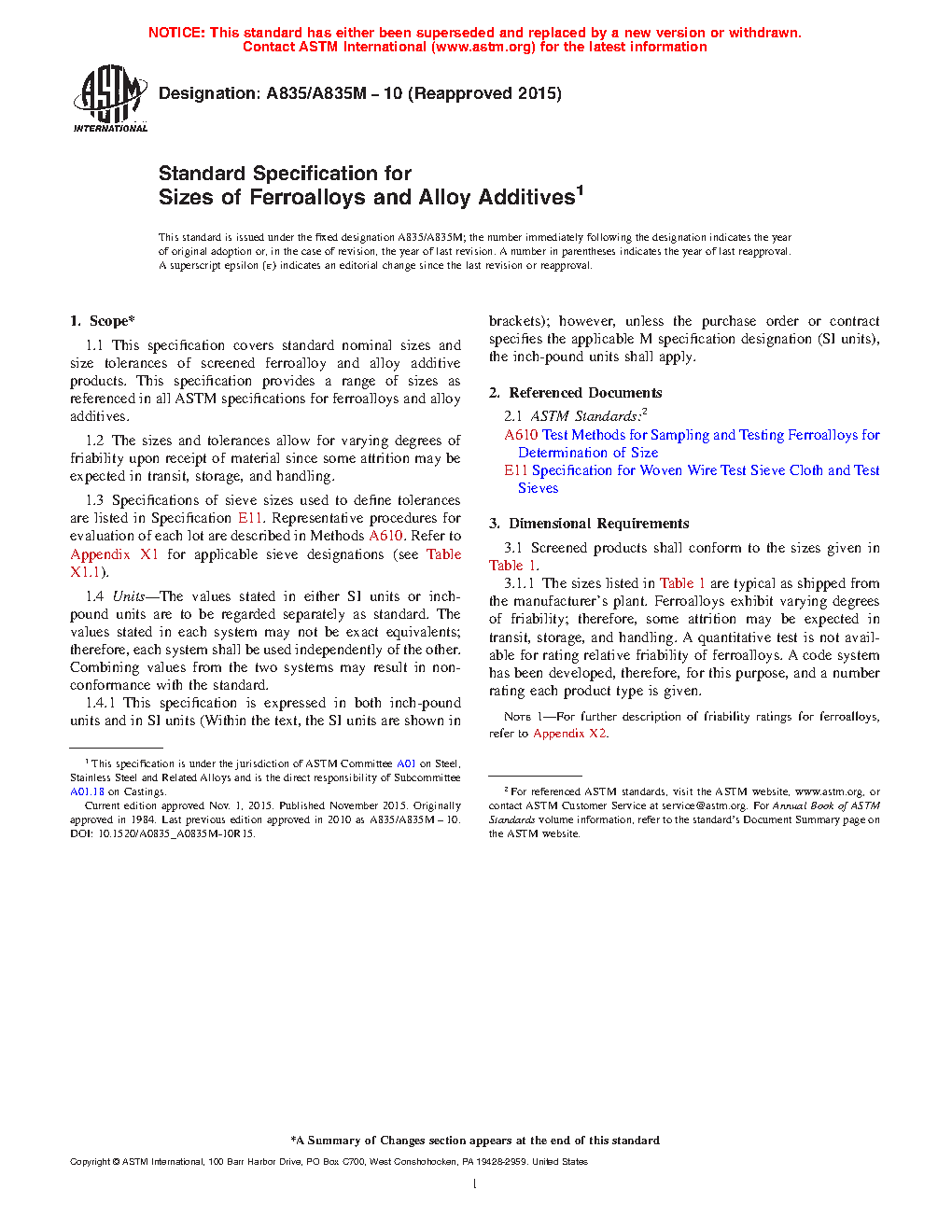 This specification covers standards for sizes of screened ferroalloys and alloy additives. Products shall conform to specified nominal size, standard ordered size, maximum allowable oversize, maximum allowable undersize, and friability rating. Description of the friability ratings of the ferroalloys is also provided.