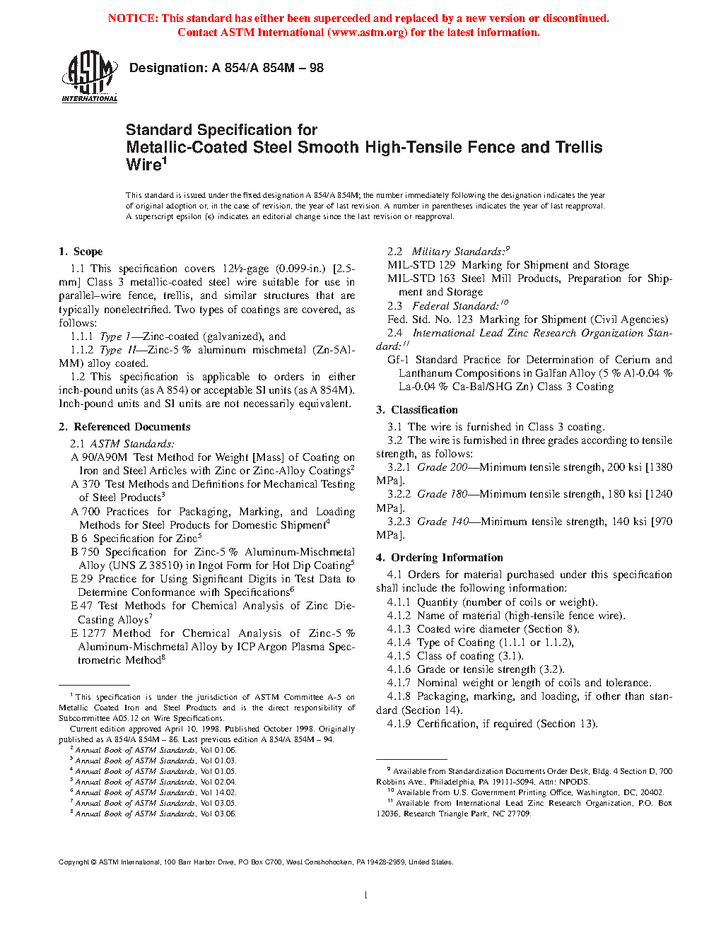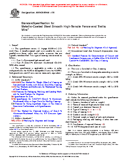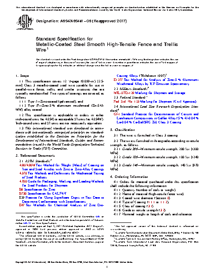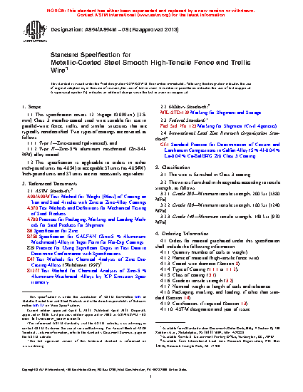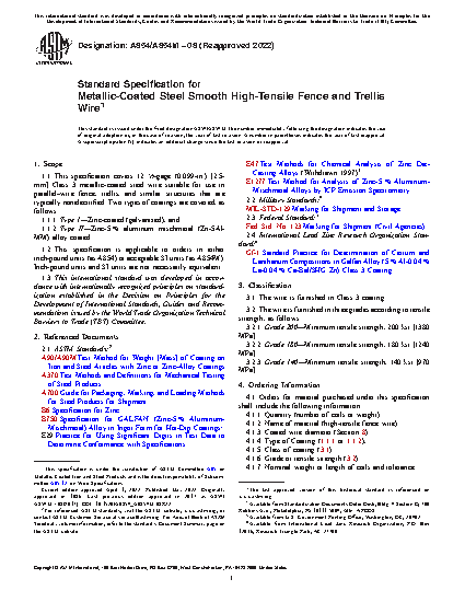 1.1 This specification covers 12 1/2-gage (0.099-in.) [2.5- mm] Class 3 metallic-coated steel wire suitable for use in parallel–wire fence, trellis, and similar structures that are typically nonelectrified. Two types of coatings are covered, as follows: