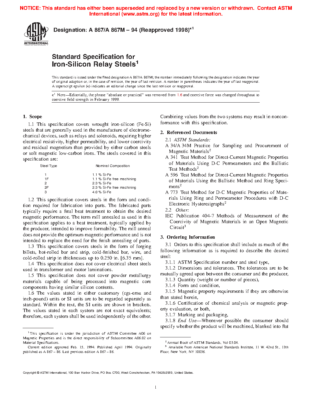 Steel Type Nominal Composition 1 1.1 % Si-Fe 1F 1.1 % Si-Fe Free Machining 2 2.3 % Si-Fe 2F 2.3 % Si-Fe Free Machining 3 4.0 % Si-Fe1.2 This specification covers steels in the form and condition required for fabrication into parts. The fabricated parts typically require a final heat treatment to obtain the desired magnetic performance. The term mill annealed as used in this specification applies to a heat treatment, typically applied by the producer, intended to improve formability. The mill anneal does not provide the optimum magnetic performance and is not intended to replace the need for the finish annealing of parts.