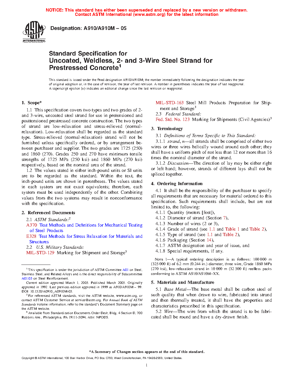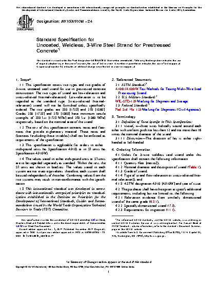 1.1 This specification covers two types and two grades of 2-wire and 3-wire, uncoated steel strand for use in prestressed concrete construction. The two types of strand are low-relaxation and stress-relieved (normal-relaxation). Low-relaxation is to be regarded as the standard type. Stress-relieved (normal-relaxation) strand will not be furnished unless specifically ordered. The two grades are 250 [1725] and 270 [1860]. Grades 250 [1725] and 270 [1860] have minimum tensile strengths of 250 ksi [1725 MPa] and 270 ksi [1860 MPa] respectively, based on the nominal area of the strand.