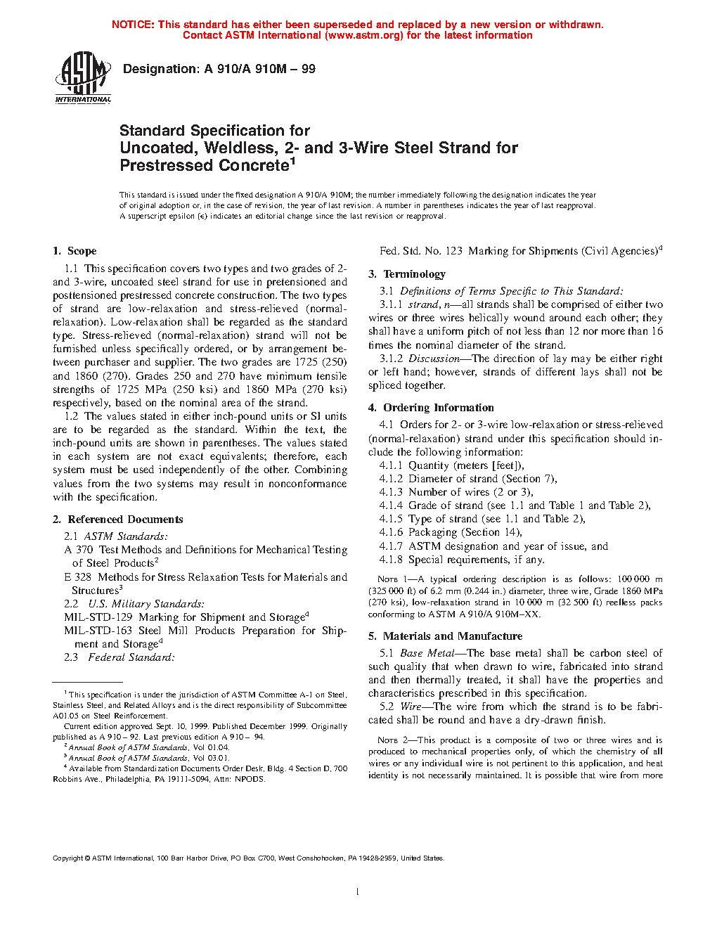 This specification covers two types and two grades of 2- and 3-wire, uncoated weldless steel and strand for use in pretensioned and posttensioned prestressed concrete construction. One specimen for test shall be taken from each production lot of finished strand and tested for breaking strength, yield strength and elongation. Strands of Grades 250 and 270 shall conform to specified breaking strength and yield strength requirements. Low relaxation strand shall also be tested as prescribed.