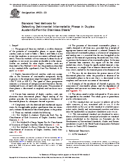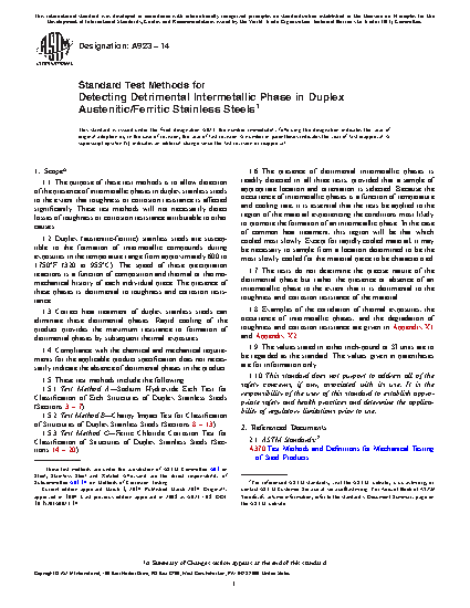 1.1 The purpose of these test methods is to allow detection of the presence of intermetallic phases in duplex stainless steels to the extent that toughness or corrosion resistance is affected significantly. These test methods will not necessarily detect losses of toughness or corrosion resistance attributable to other causes.