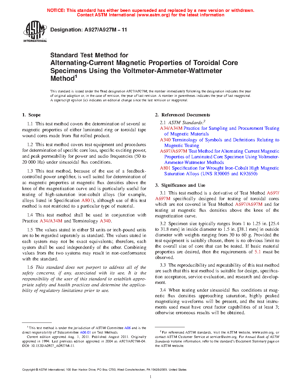 1.3 This test method, due to the use of a feedback-controlled power amplifier, is well suited for determination of ac magnetic properties at magnetic flux densities above the knee of the magnetization curve and is particularly useful for testing of high-saturation iron-cobalt alloys (for example, alloys listed in Specification A801), although use of this test method is not restricted to a particular type of material.