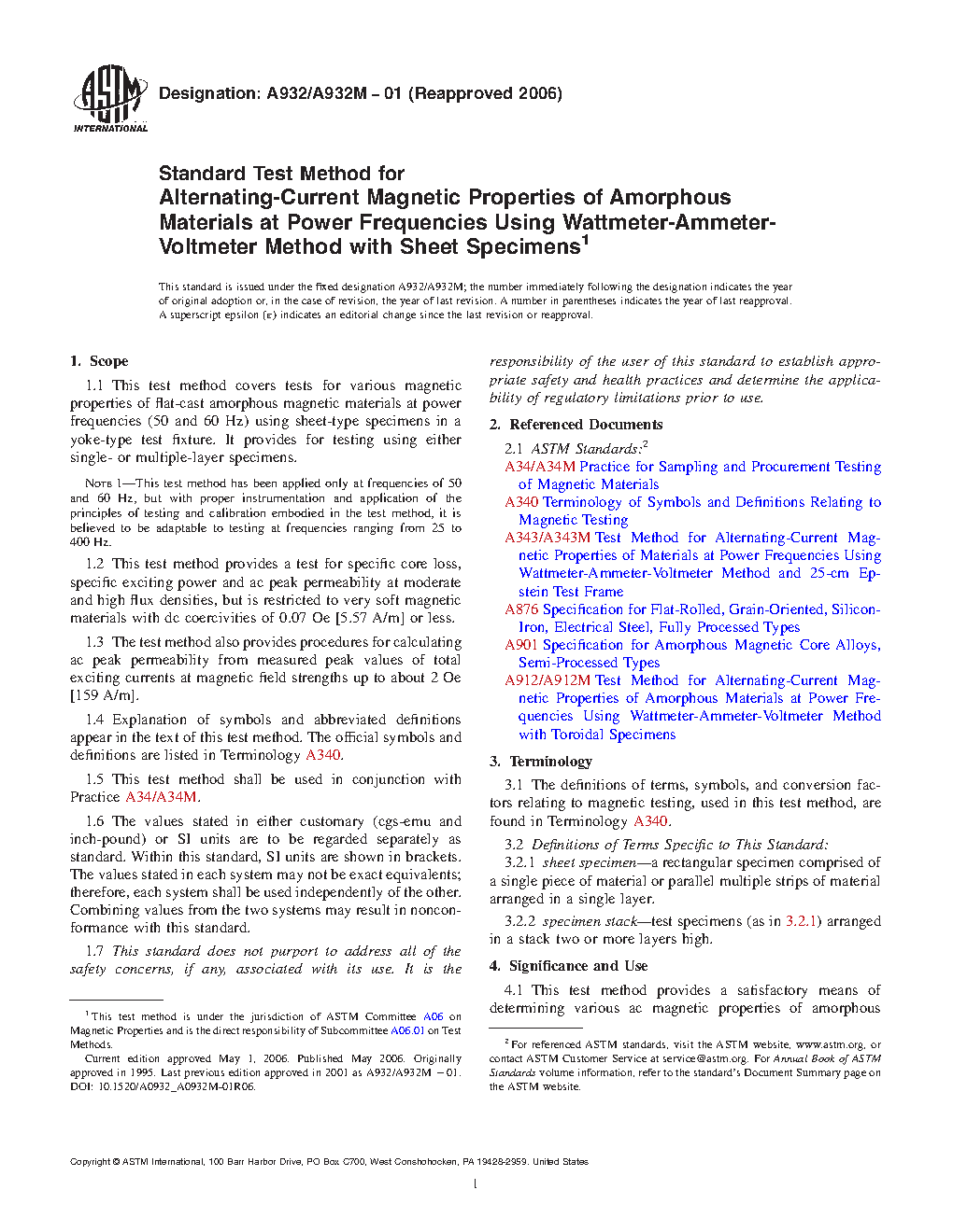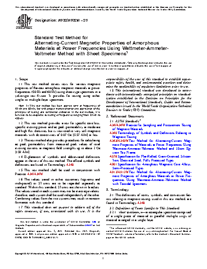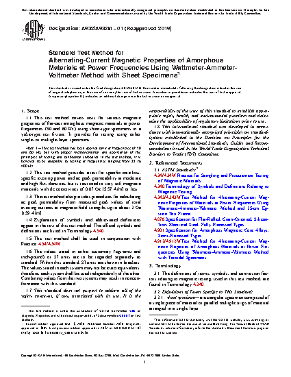 1.1 This test method covers tests for various magnetic properties of flat-cast amorphous magnetic materials at power frequencies (50 and 60 Hz) using sheet-type specimens in a yoke-type test fixture. It provides for testing using either single- or multiple-layer specimens.