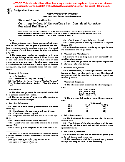 Standard Specification for Centrifugally Cast White Iron/Gray Iron Dual Metal Abrasion- Resistant Roll Shells