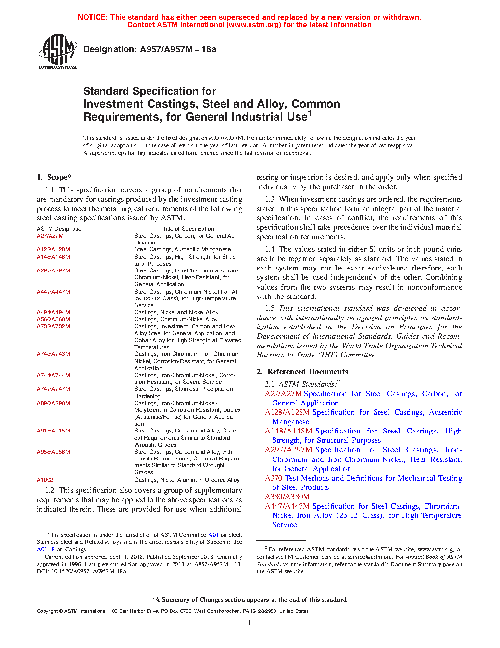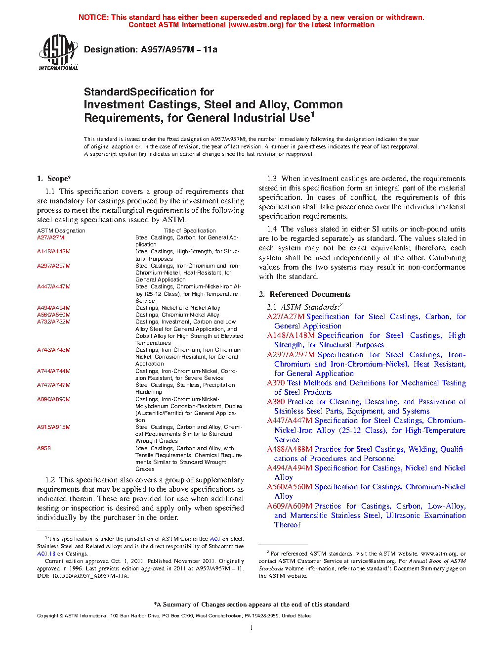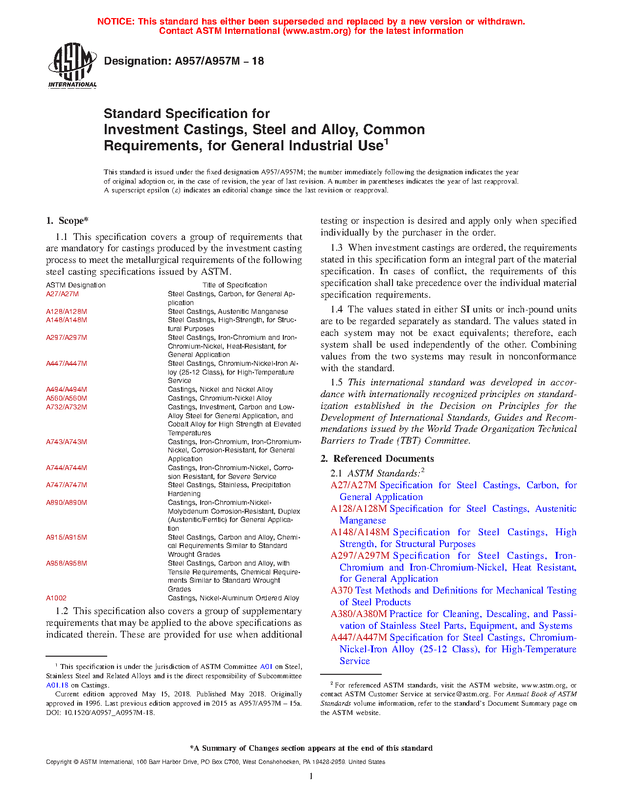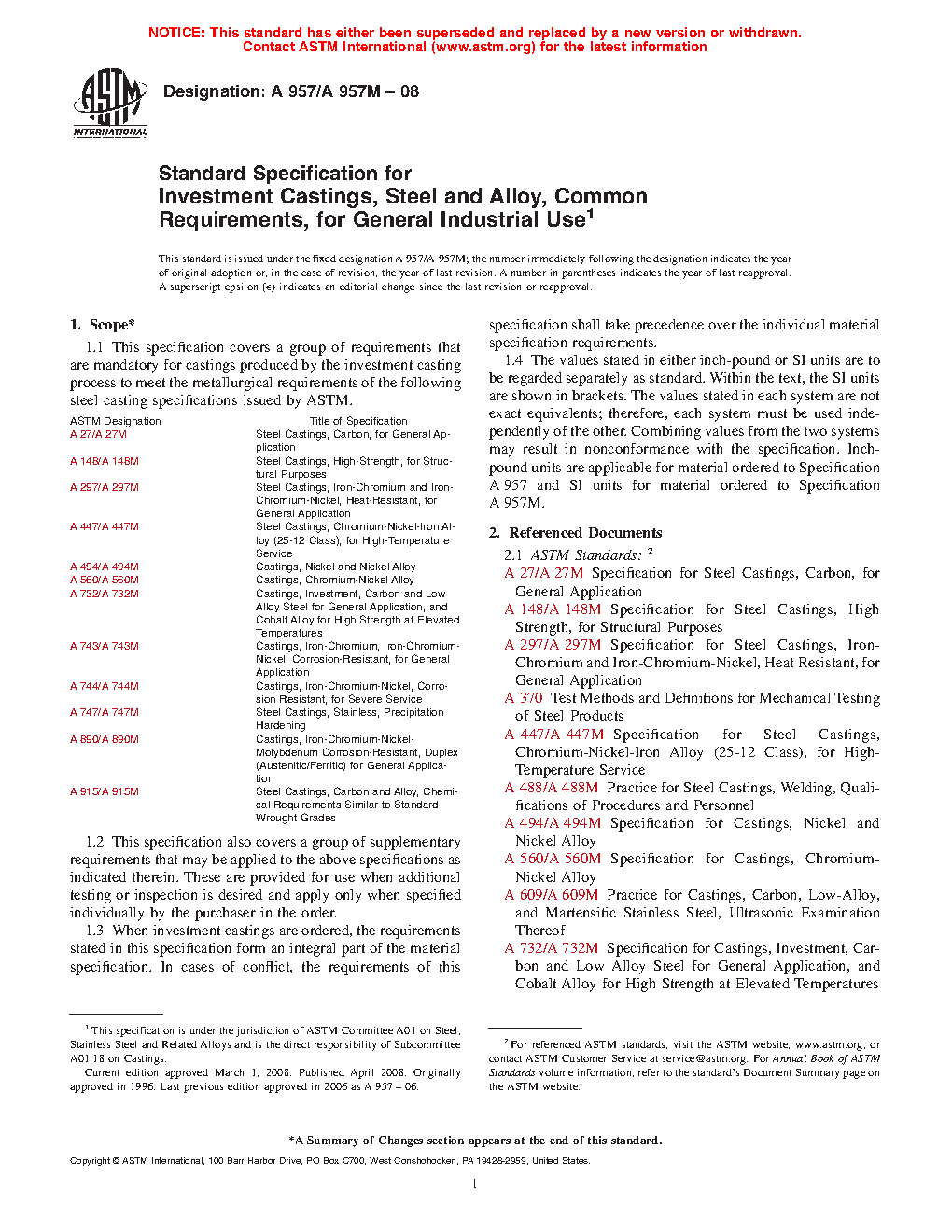 1.1 This specification covers a group of requirements that are mandatory for castings produced by the investment casting process to meet the metallurgical requirements of the following steel casting specifications issued by ASTM.