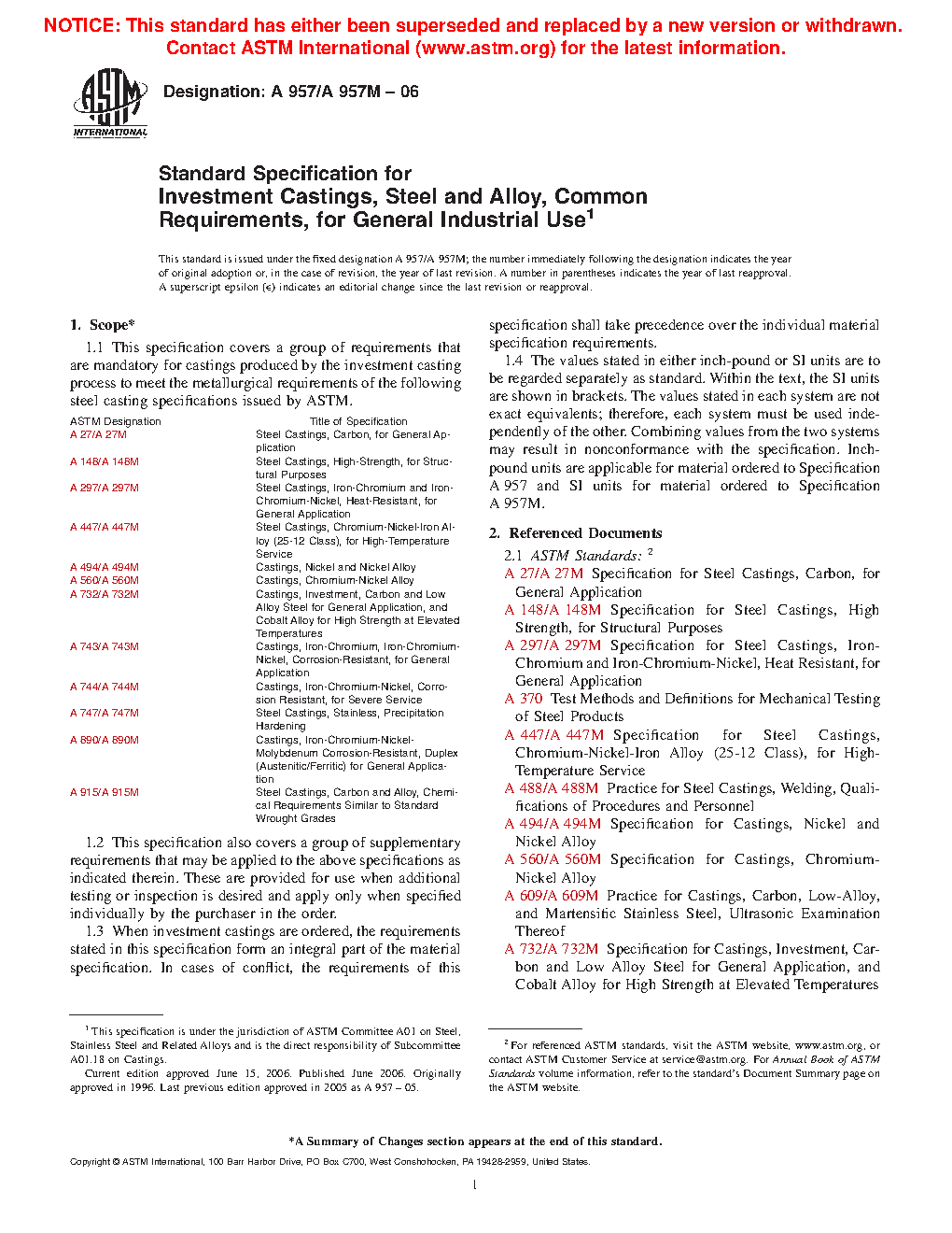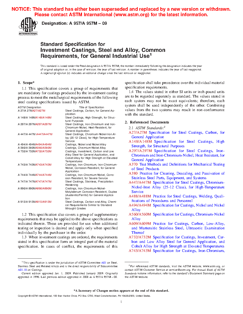 | A732/A732M | Castings, Investment, Carbon and Low-Alloy Steel for General Application, and Cobalt Alloy for High Strength at Elevated Temperatures |