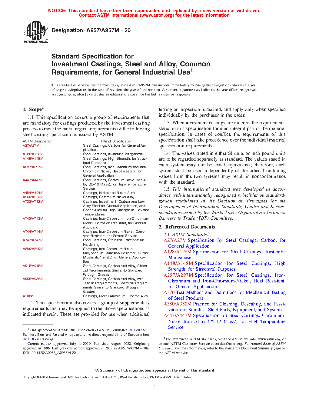 | A743/A743M | Castings, Iron-Chromium, Iron-Chromium-Nickel, Corrosion-Resistant, for General Application |