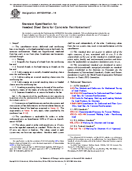 This specification covers deformed and plain steel reinforcing bars in cut lengths with a head attached to one or both ends for reinforcing concrete structures. This standard applies only to headed bars with welded, threaded or forged heads. Material, manufacturing and testing requirements for the reinforcing bars shall be in accordance with other ASTM documents listed herein.