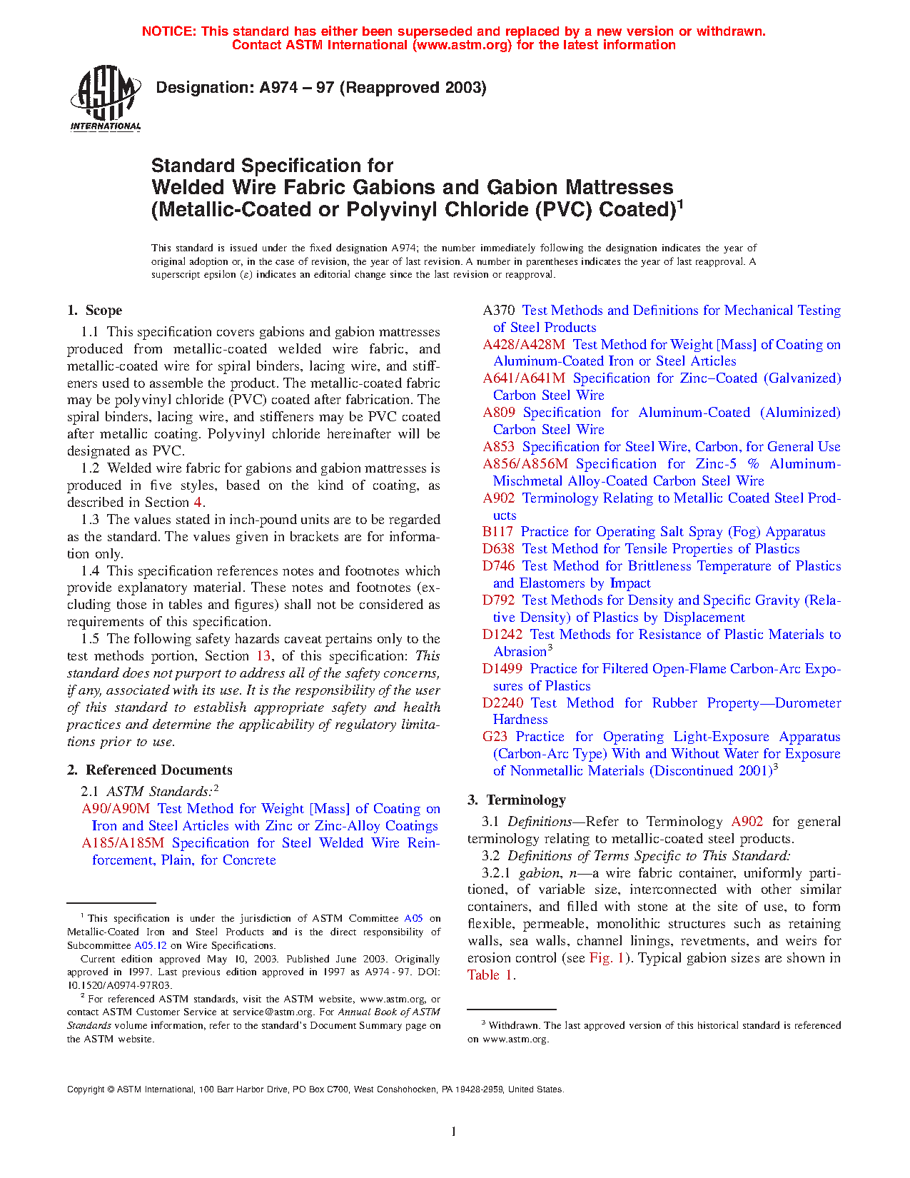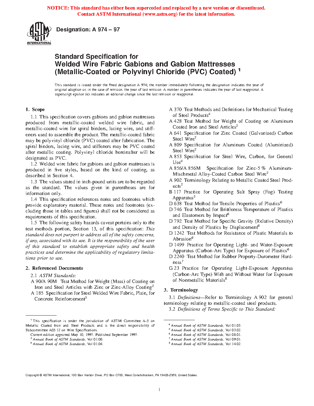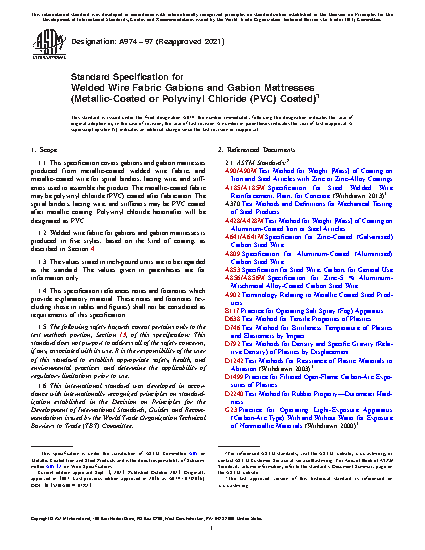 1.1 This specification covers gabions and gabion mattresses produced from metallic-coated welded wire fabric, and metallic-coated wire for spiral binders, lacing wire, and stiffeners used to assemble the product. The metallic-coated fabric may be polyvinyl chloride (PVC) coated after fabrication. The spiral binders, lacing wire, and stiffeners may be PVC coated after metallic coating. Polyvinyl chloride hereinafter will be designated as PVC.