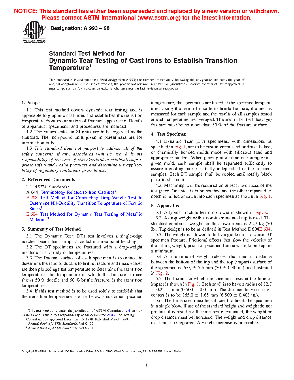 1.1 This test method covers dynamic tear testing and is applicable to graphitic cast irons and establishes the transition temperature from examination of fracture appearance. Details of apparatus, specimens, and procedures are included.