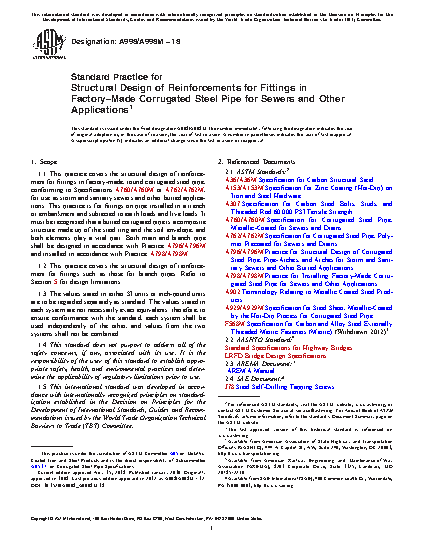1.1 This practice covers the structural design of reinforcement for fittings in factory-made, round corrugated steel pipe,conforming to Specifications A760/A760M or A762/A762M, for use as storm and sanitary sewers and other buried applications. This practice is for fittings on pipe installed in a trench or embankment and subjected to earth loads and live loads. It must be recognized that a buried corrugated pipe is a composite structure made up of the steel ring and the soil envelope, and both elements play a vital part. Both main and branch pipe shall be designed in accordance with Practice A796/A796M and installed in accordance with Practice A798/A798M.