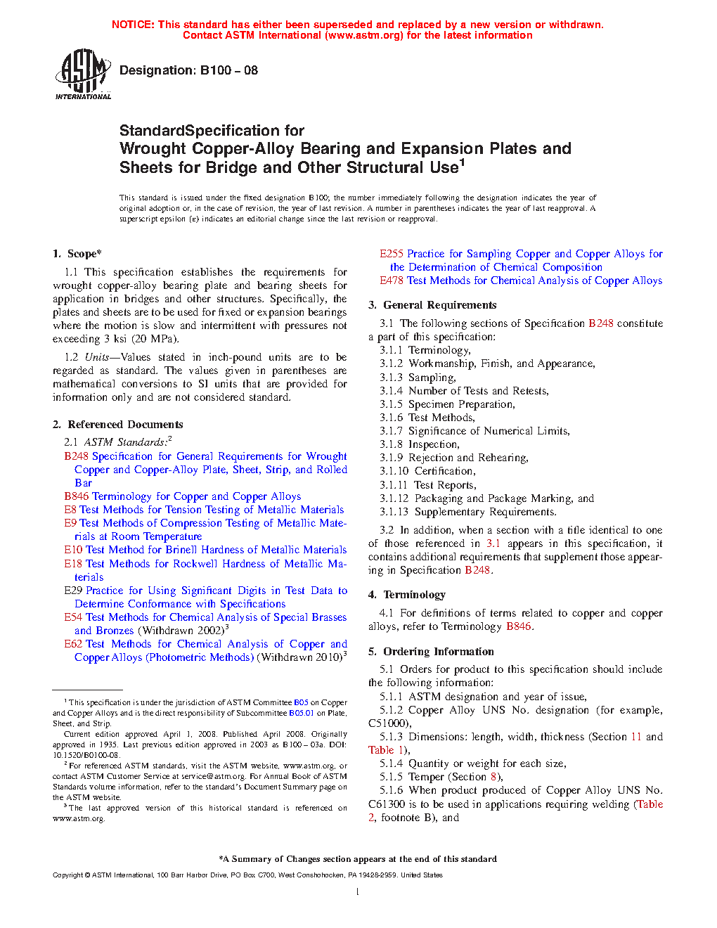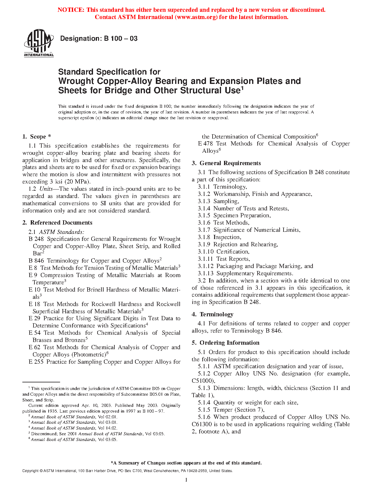 1.1 This specification establishes the requirements for wrought copper-alloy bearing plate and bearing sheets for application in bridges and other structures. Specifically, the plates and sheets are to be used for fixed or expansion bearings where the motion is slow and intermittent with pressures not exceeding 3 ksi (20 Mpa).