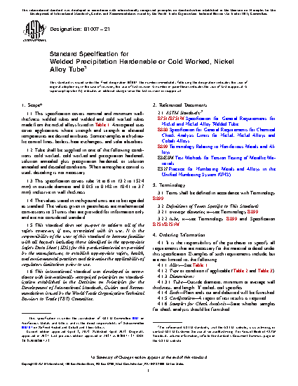 1.1 This specification covers nominal and minimum wall-thickness welded tubes and welded and cold worked tubes made from the nickel alloys listed in Table 1. Anticipated uses cover applications where strength and strength at elevated temperatures are desired attributes. Some examples are hydraulic control lines, boilers, heat exchangers, and solar absorbers.