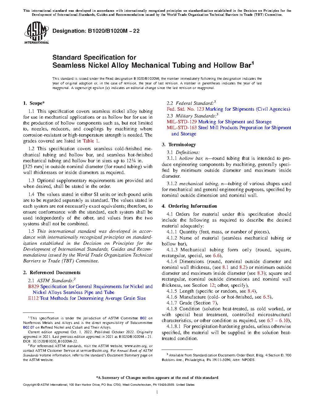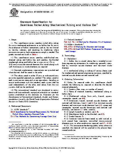 1.1 This specification covers seamless nickel alloy tubing for use in mechanical applications or as hollow bar for use in the production of hollow components such as, but not limited to, nozzles, reducers, and couplings by machining where corrosion-resistant or high-temperature strength is needed. The grades covered are listed in Table 1.