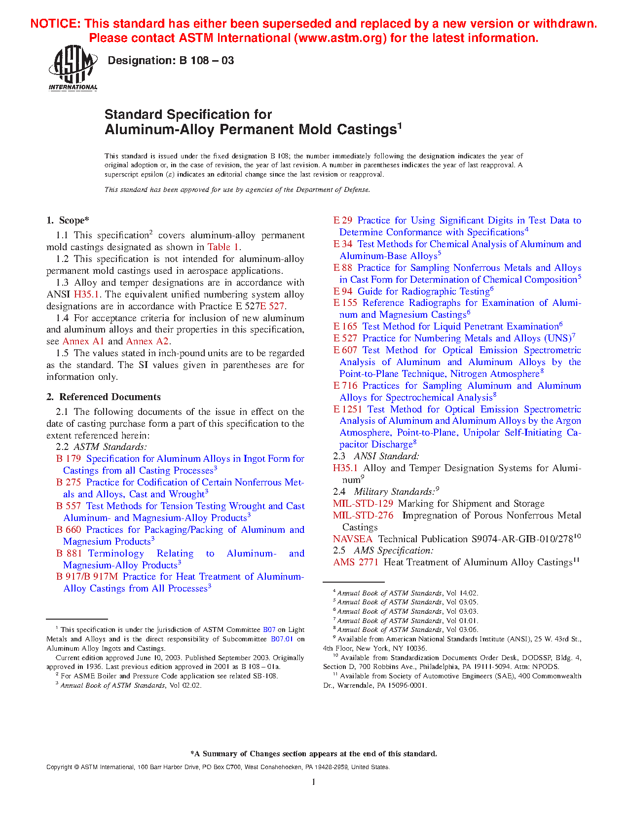 1.2 This specification is not intended for aluminum-alloy permanent mold castings used in aerospace applications.