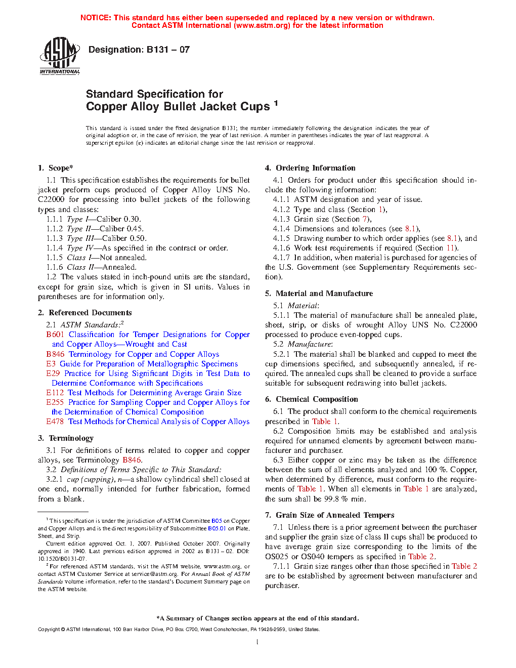 This specification covers bullet jacket preform cups made from UNS C22000 wrought copper alloy used for processing Types I-IV and Classes I-II bullet jackets. This standard contains information on chemical composition, grain size and testing requirements for the preform cups.
